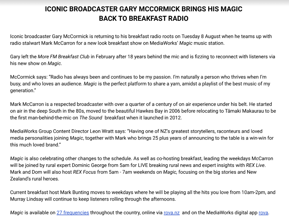 If itās Christchurch based, I reckon the plan will be to eventually move Lana Searle to Magic with Gary and The Breakfast Club Auckland based with new hosts for Paul Ego.