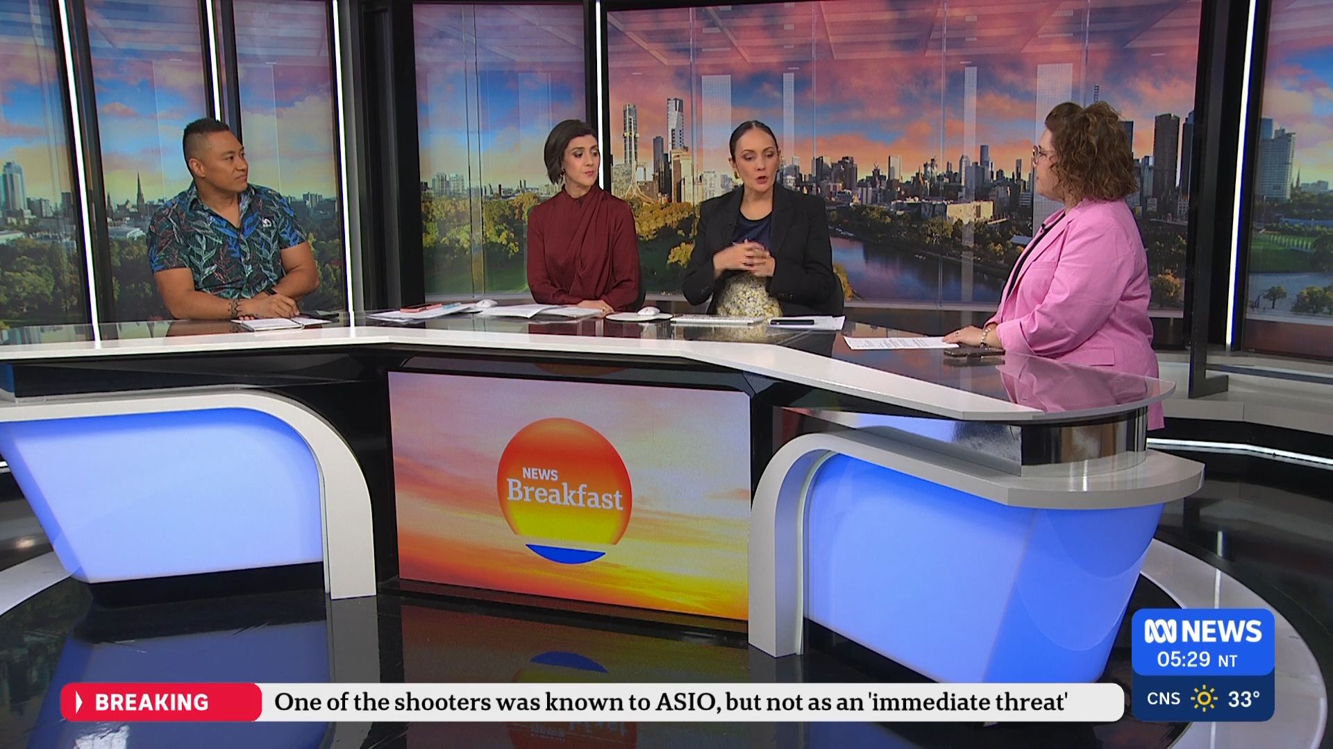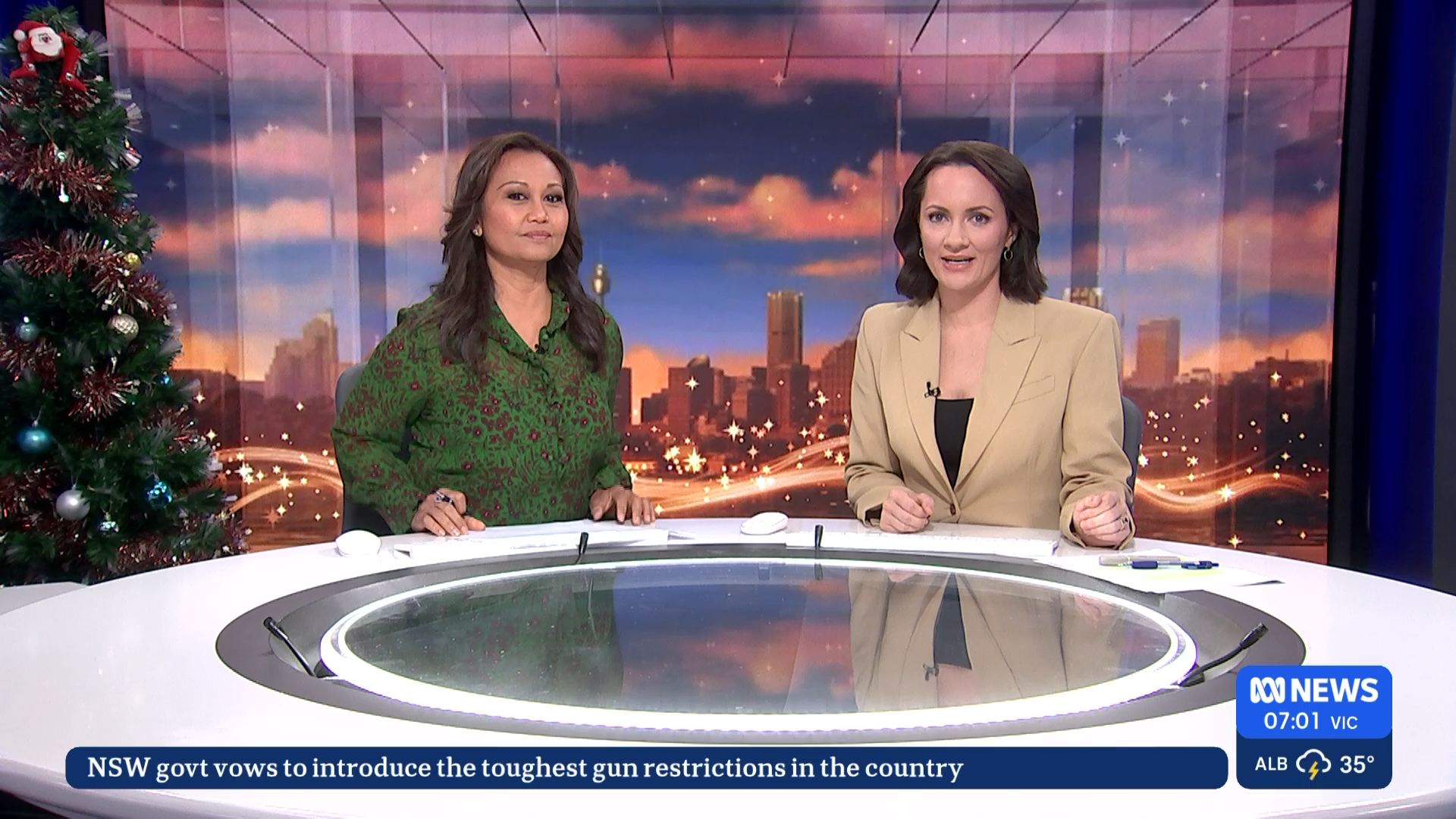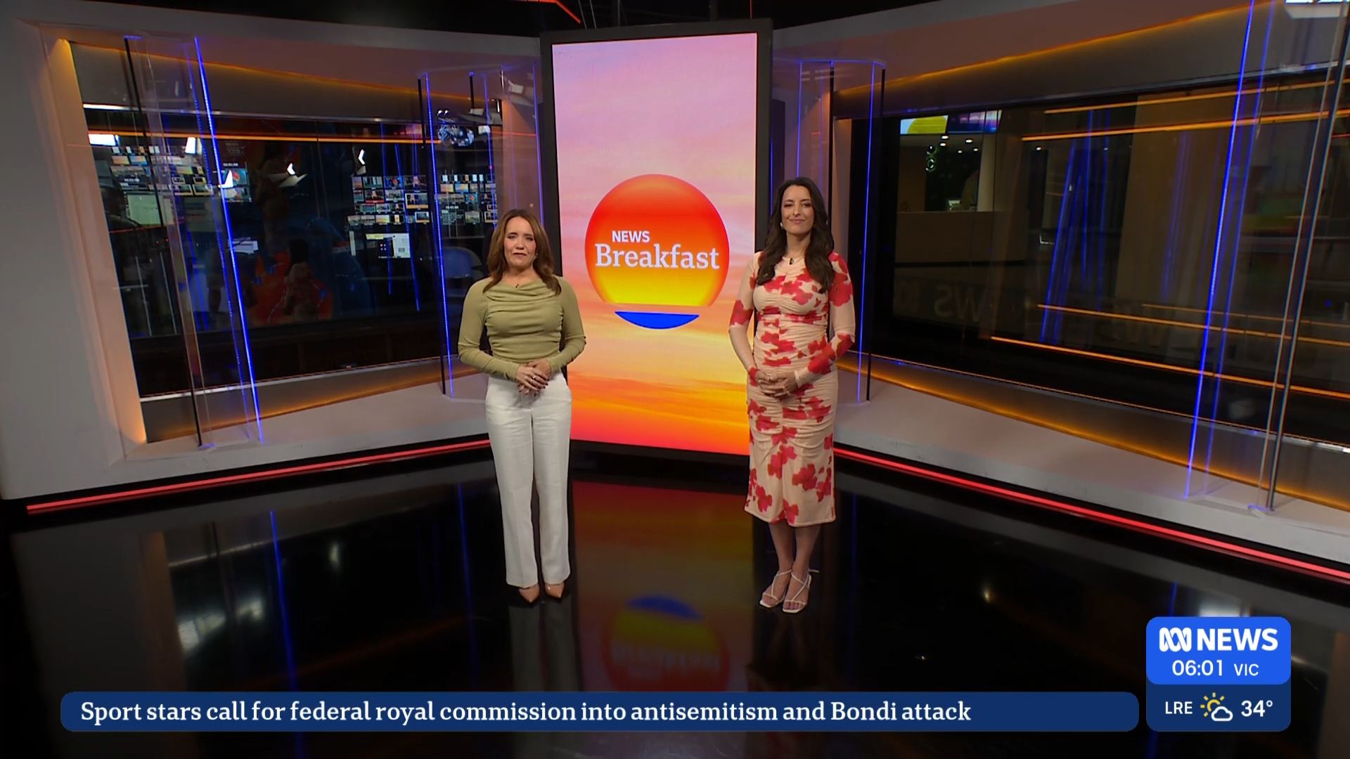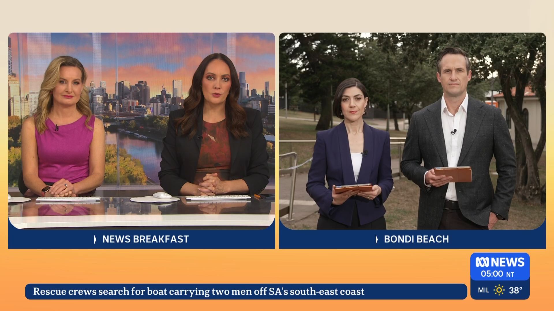 Thursday (18.12.2025): Emma reporting on the terrorist attack live from Bondi, with James and Bridget back in studio. No separate news or sport presenters.