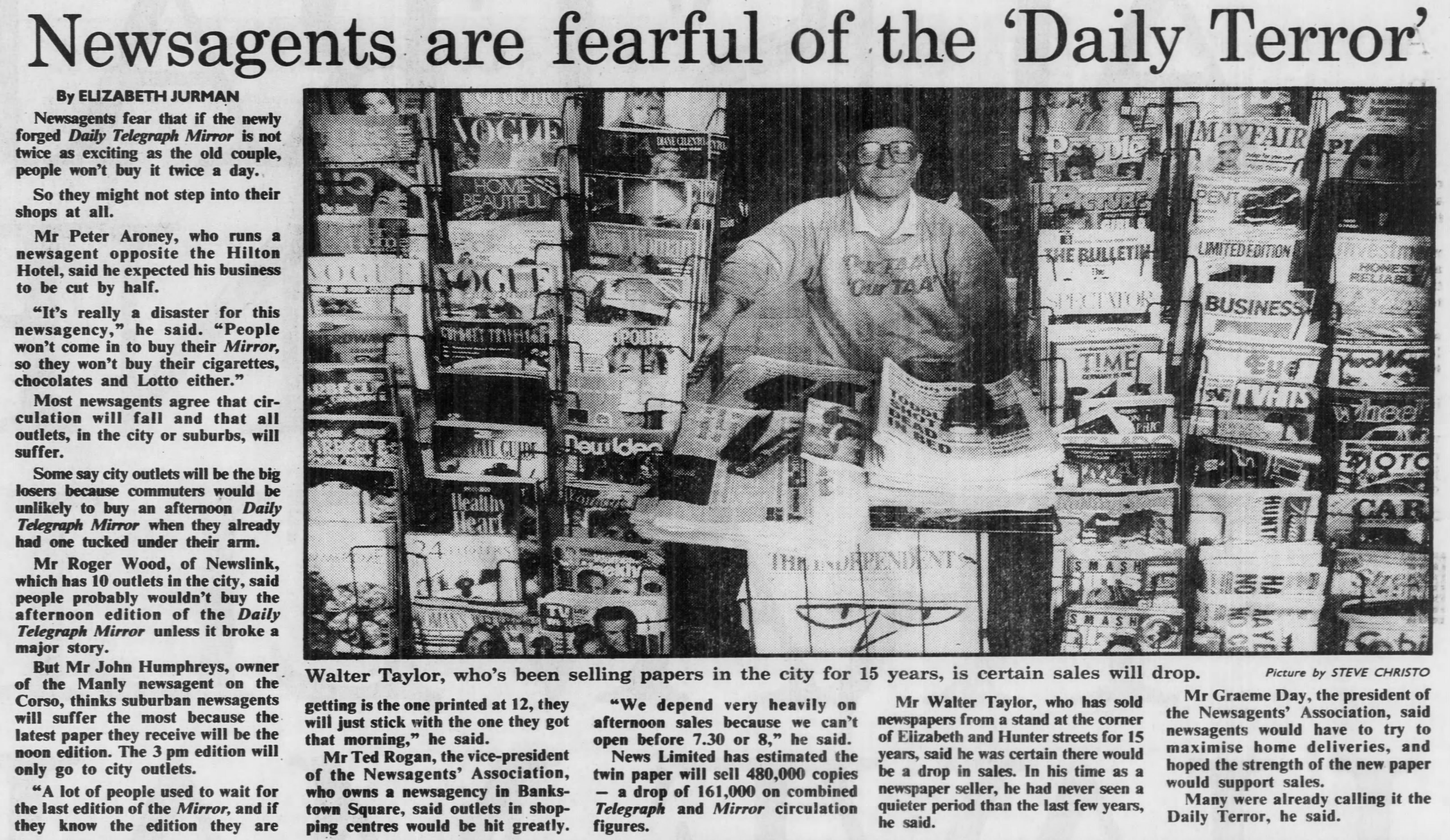 Once upon a time I used to buy all six Sydney newspapers - the SMH, Sun, Telegraph, Mirror, Australian and AFR on some days, the Sun-Herald and Telegraph on Sundays and occasionally the trashy Sunday Mirror, and the weekly National Times. The Sunday edition of The Australian didnât last very long and I actually donât recall buying it.