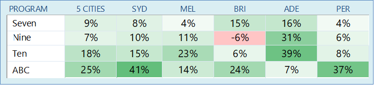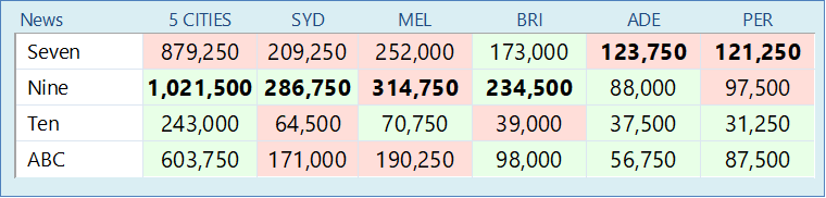 Nine had a rare national win - reach, average and BVOD. Nine improved by 44,000 on the previous week, ABC was up 18,000, 10 by 3,000. Seven lost 9,000.