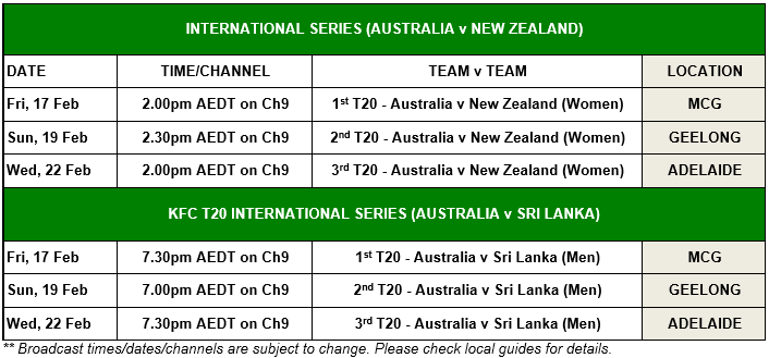 The Nine Network will broadcast all the action of the KFC T20 International Series from Friday 17 February at 2pm AEDT when the Australian men’s team take on Sri Lanka and the Australian women’s team, the Commonwealth Bank Southern Stars, play New Zealand.