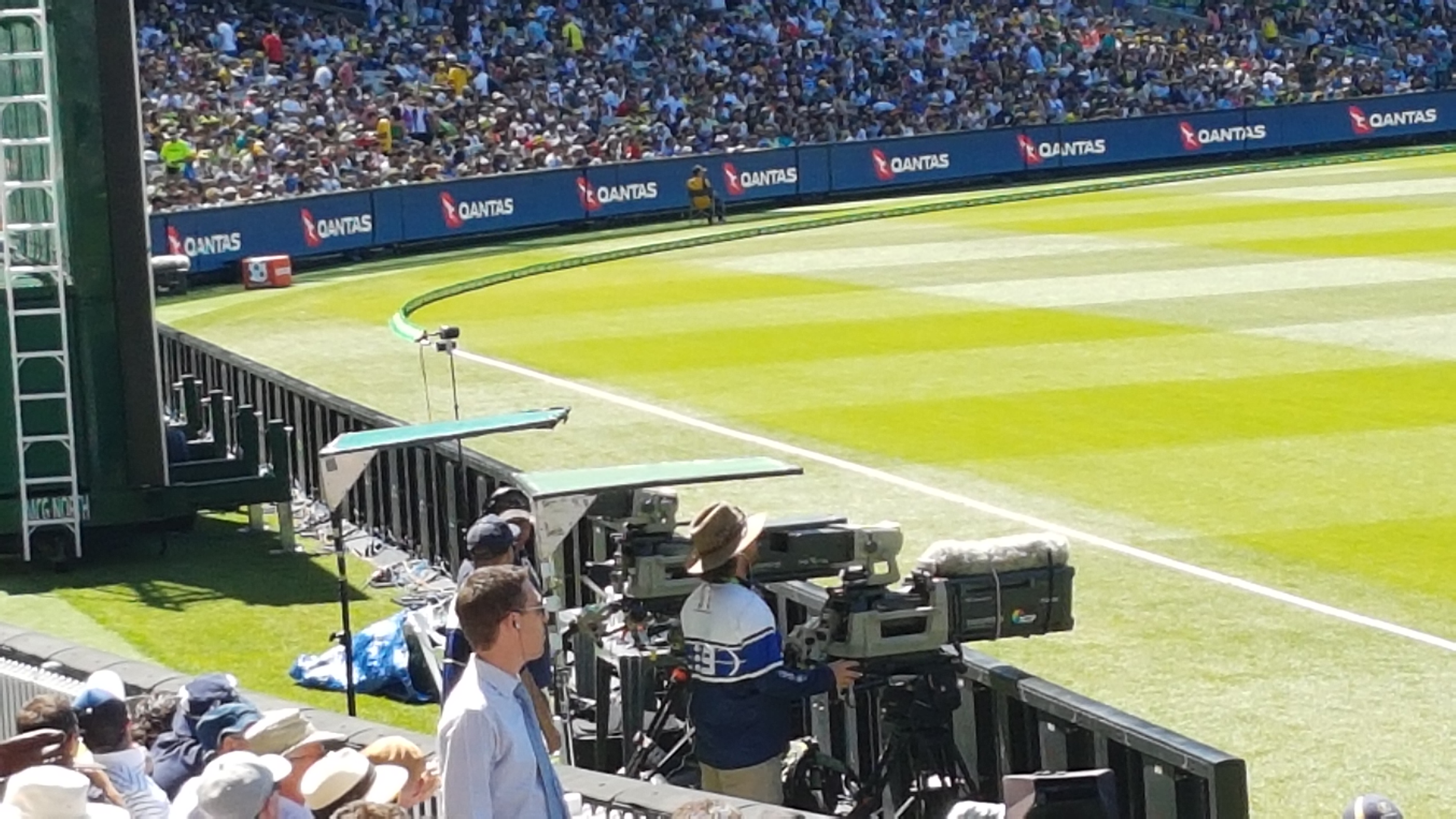 Nicholas, Warne, Taylor and Healy hosting Boxing Day test pre-match from the platform above the vehicle entrance, between the Ponsford and Great Southern stands of the MCG.