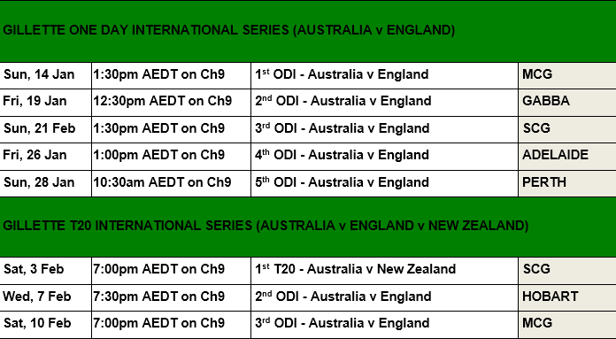 This Sunday, January 14, Australia clash with England in Melbourne at the MCG in the first of five One Day International games. Coverage begins at 1.30pm AEST on Channel Nine.