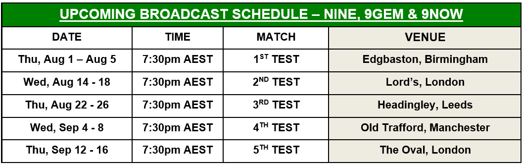 All five Test matches between Australia and England will be LIVE, EXCLUSIVE and in HD during primetime on Nine and 9GEM ( varies by state - check guides for details), and streamed live on 9Now.