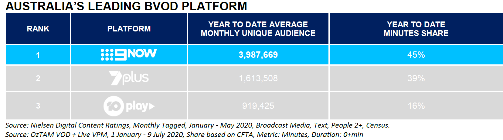 Source: OzTAM (Metro) & Regional TAM (Regional) overnight data (at 10/07/20), 01/01/20- 08/07/2020. FTA primary & multi channels + affils, AUD (ranked on Met+Reg), excludes encore/rpt/®/M-, Total People.