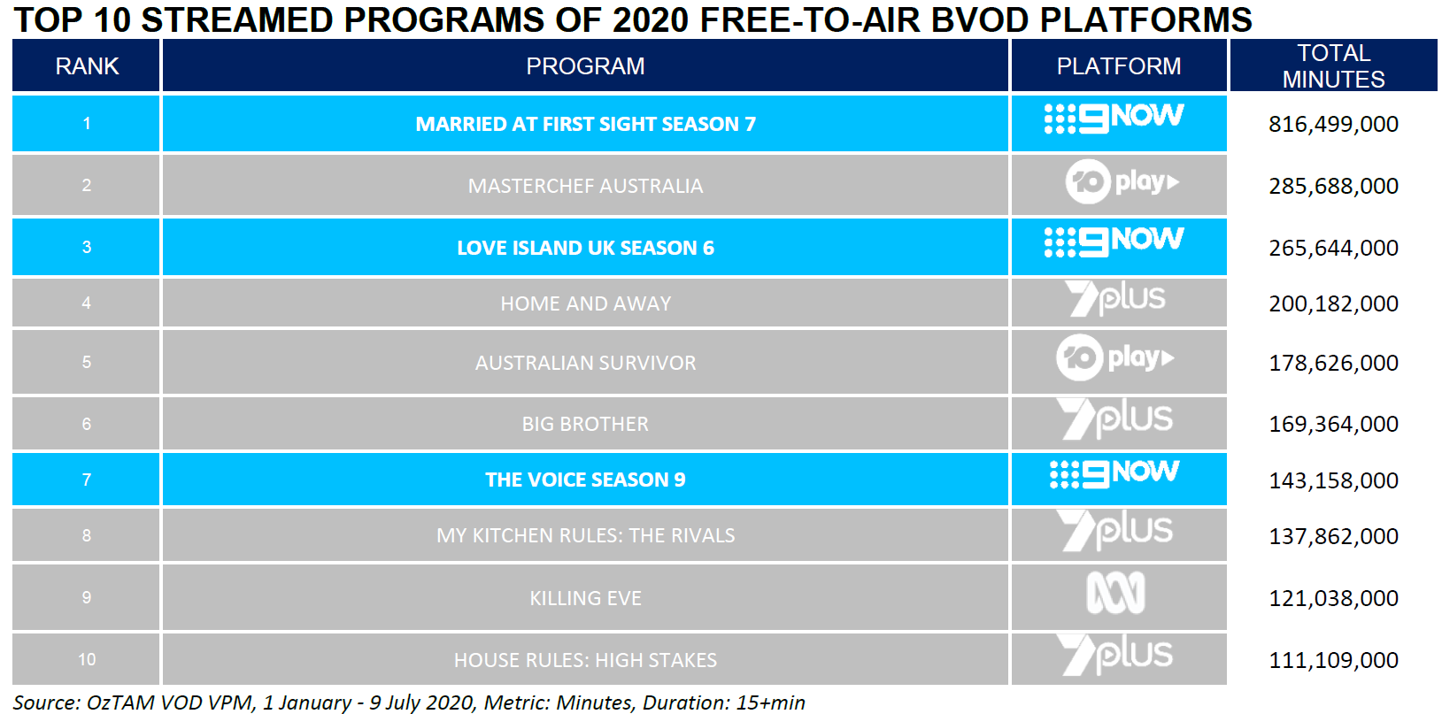 9Now also has the most streamed program across all BVOD platforms, with Married at First Sight accruing a total more than 816 million VOD minutes streamed – almost three times as much its nearest competitor.