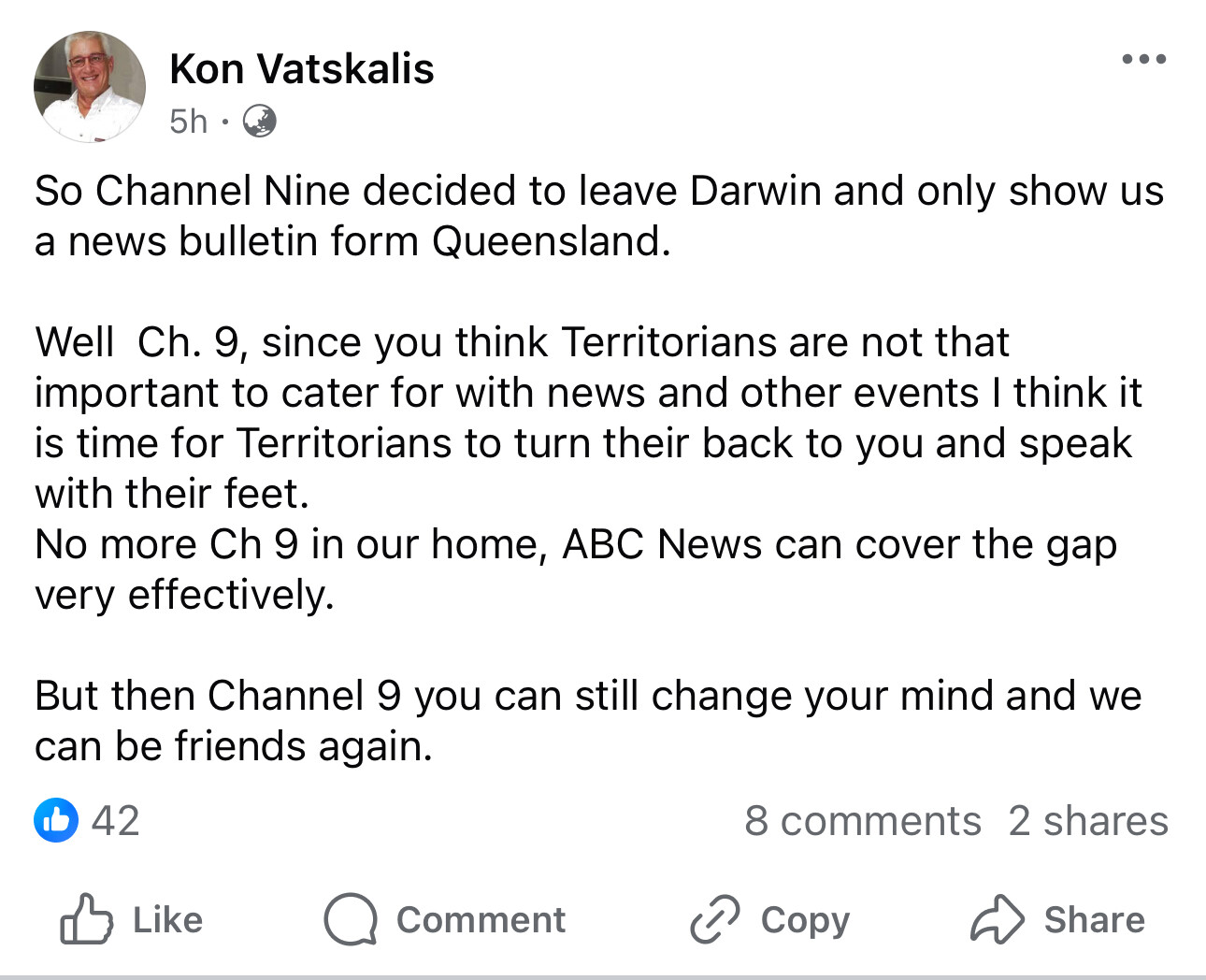 And I reckon a large number of local advertisers in the Darwin area will be boycotting NTD over this decision in protest, which in turn will negatively affect Nine Darwin’s ad revenue. Local businesses will find out that 9News Darwin has been axed, and then they’ll boycott, better instead putting their money towards advertising on SCA-7 Darwin (which still has some form of local news as noodle updates fed into ad breaks) and DTD-10 Darwin.