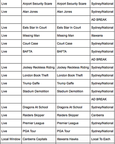 For News and Sport windows, there are 6 of them, Newcastle (live), Central Coast, Mid North Coast, North West Slopes, Far North Coast and Gold Coast.