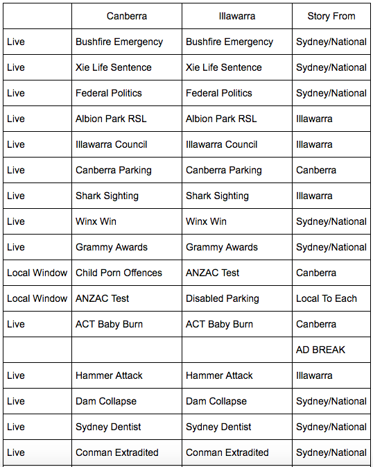 It looks as though the last 2 stories after the âGrammy Awardsâ story in the first block might have been a local window, maybe. But weird that both markets aired the ANZAC Test Match stories given that itâs highlighted here that it was mostly a Canberra story, it would be weird to feature in an Illawarra local window.