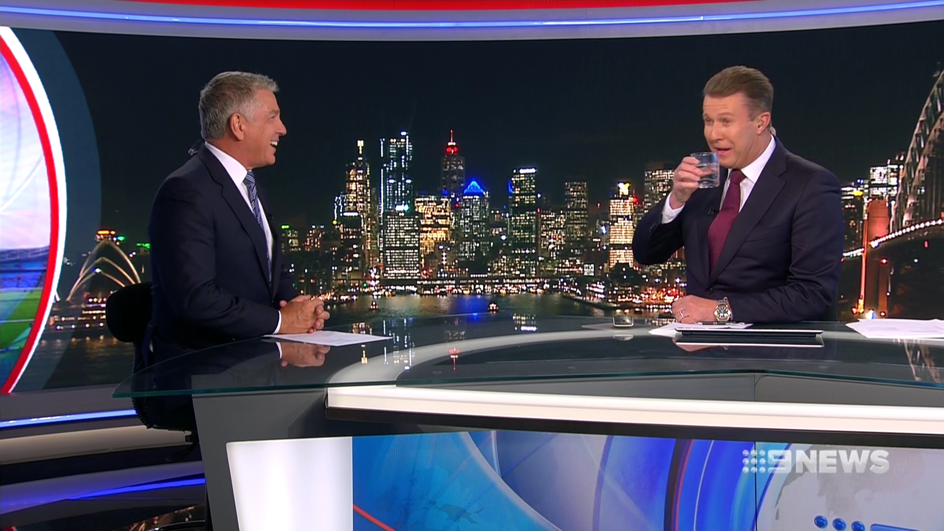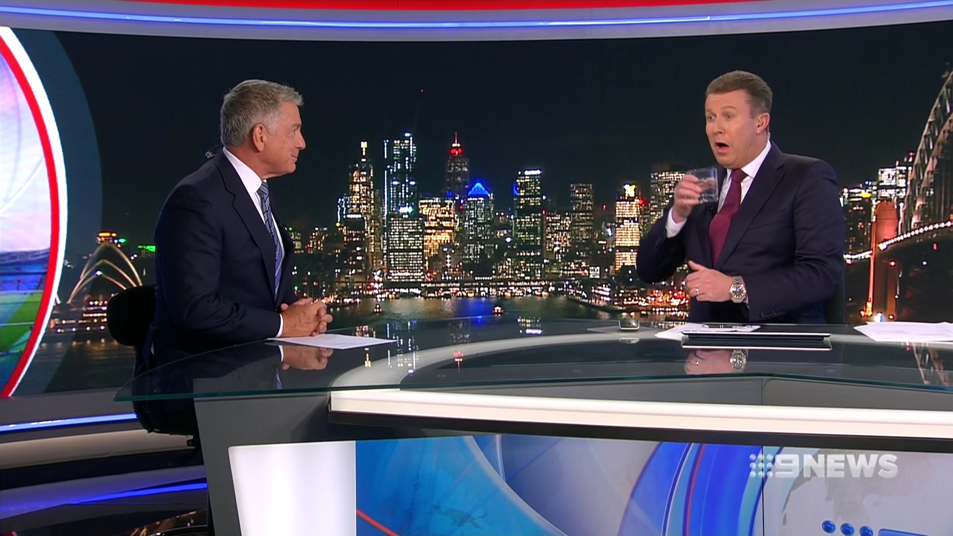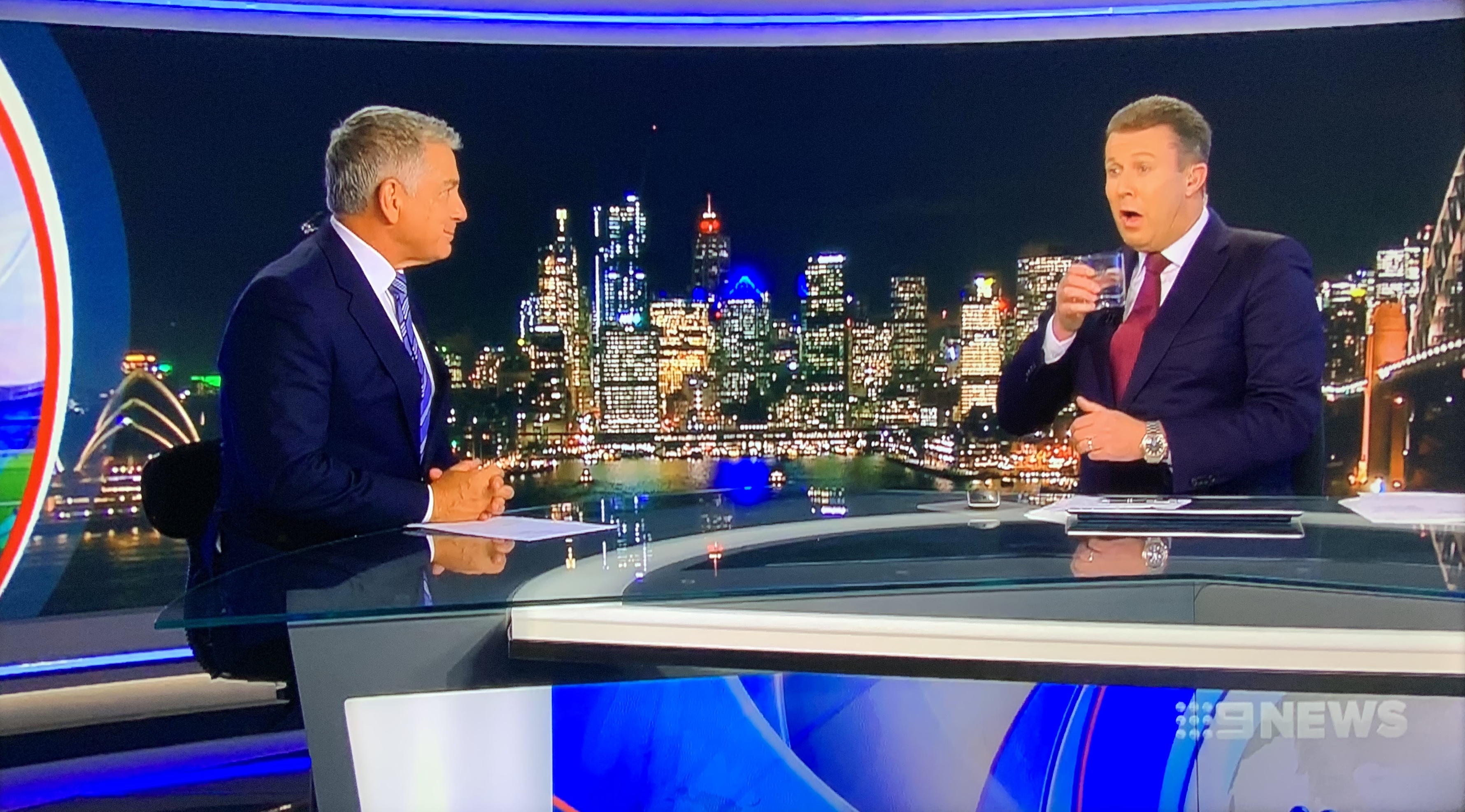 Funny moment in the Sydney bulletin with Overton caught off guard having a drink as Cameron was wrapping up the sport preview.