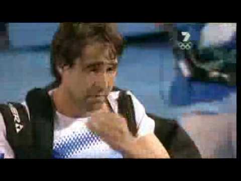 Christine Ahern reporting on Lleyton Hewitt’s marathon all-nighter 5 setter starting at midnight back in January 2008 (also a look at the network/GTV’s set, look and a former fill-in presenter):