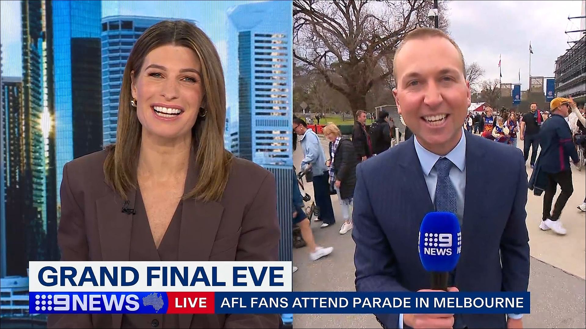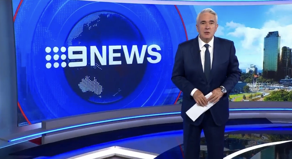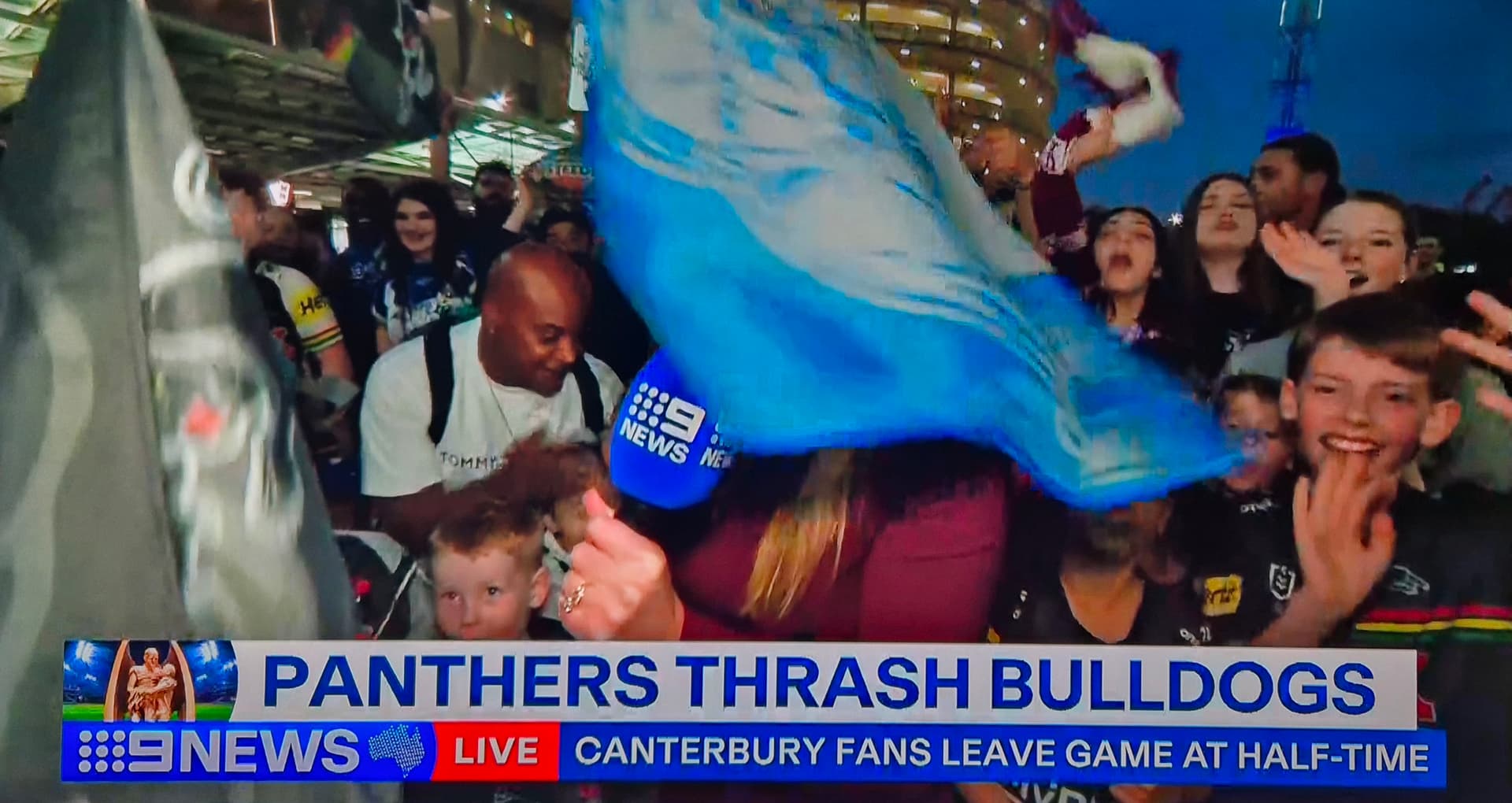 A Canterbury Bulldogs flag reporting for Nine News Sydney with Madison Scott holding the mic for it.