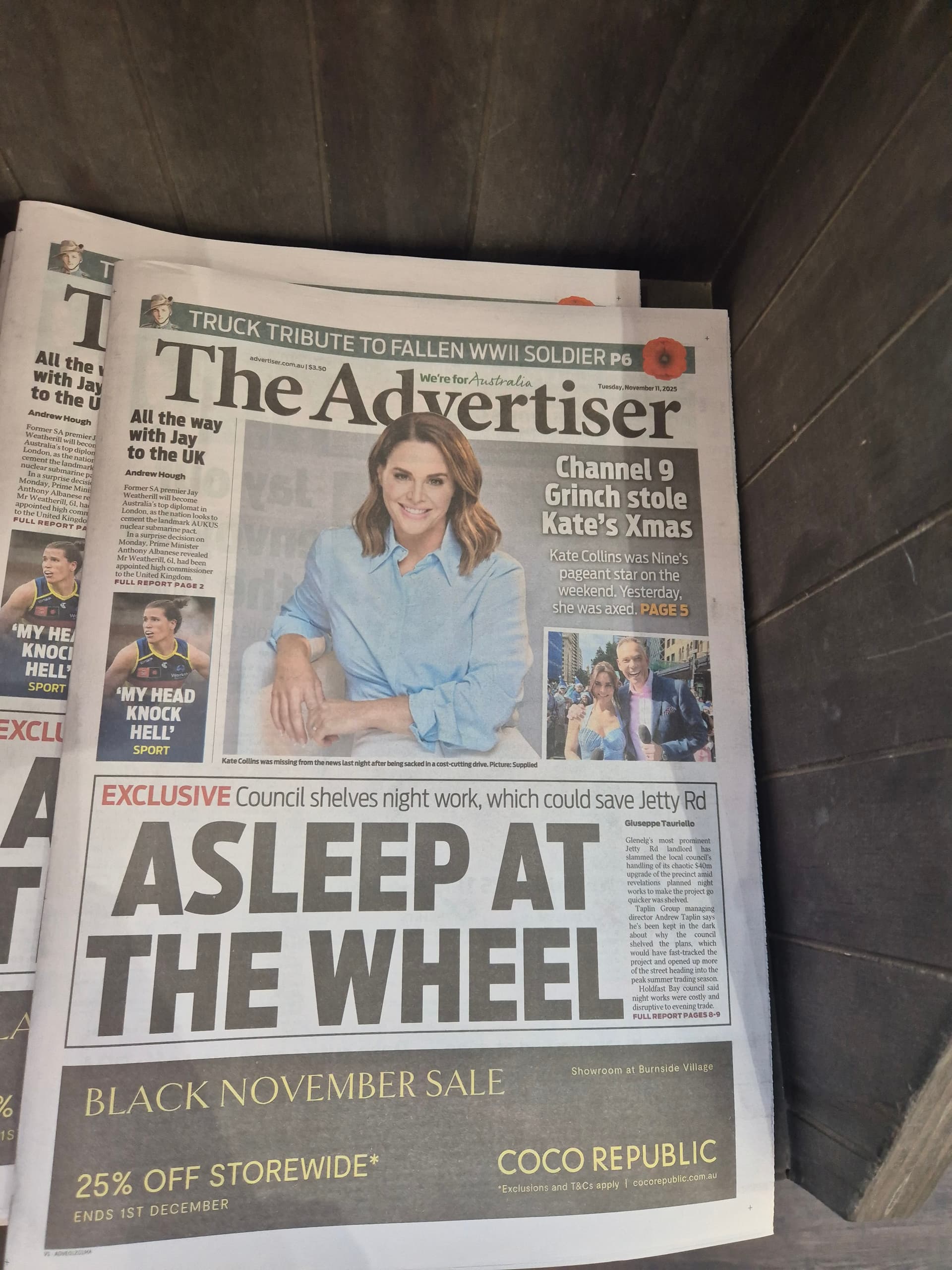 “I reckon the biggest story in Adelaide right now is the way poor old Kate Collins has been treated by Channel 9,” he said.