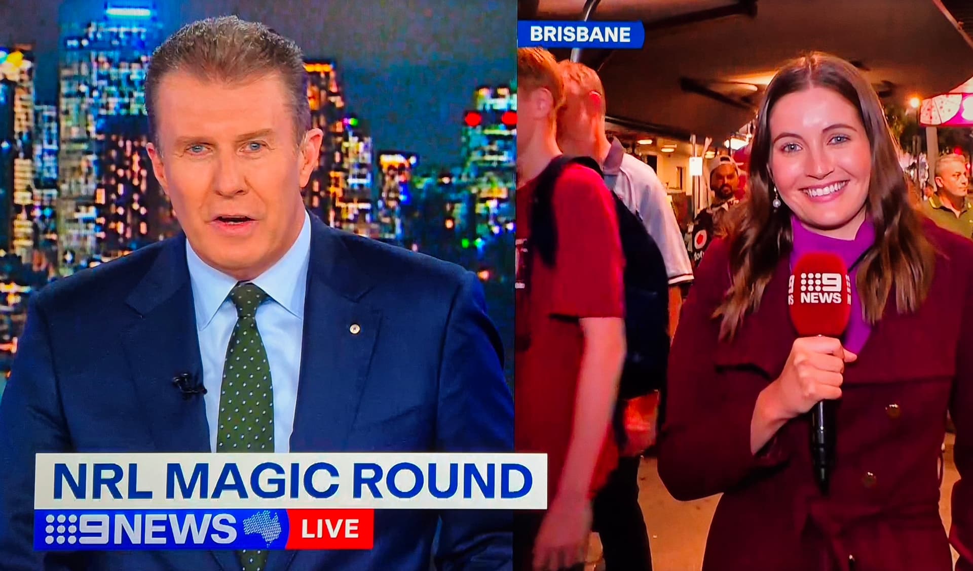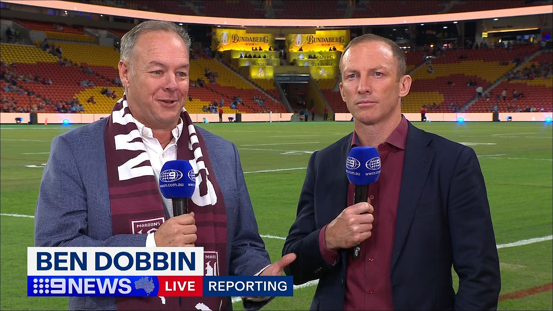 Peter Overton crossed to Abbey Geran in Brisbane ahead of the Women’s Origin game tonight. She apologised for the maroon coloured microphone!