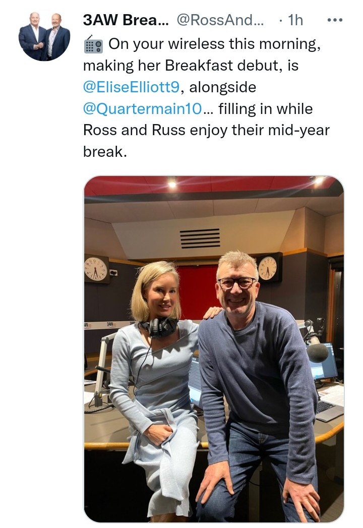 And Tom Elliot is now on filling in for Neil Mitchell. I wonder if Elise and Tom car pooled together this morning.