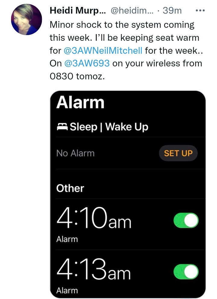 I wonder if Michael is in a similar situation. Having been on nights for so very long, maybe the routine works on a personal level. Also given daytime 2GB is less stridently conservative since Nine took over and Alan left, maybe Michael finds there’s less interference in his content in the middle of the night. Nine may also be cognisant that it’s difficult to find someone who is both willing and good at the shift, given the unique challenge of filling time in an interesting manner for hours on end every single day, and be happy to keep Michael happy by not pushing his body clock around too often.