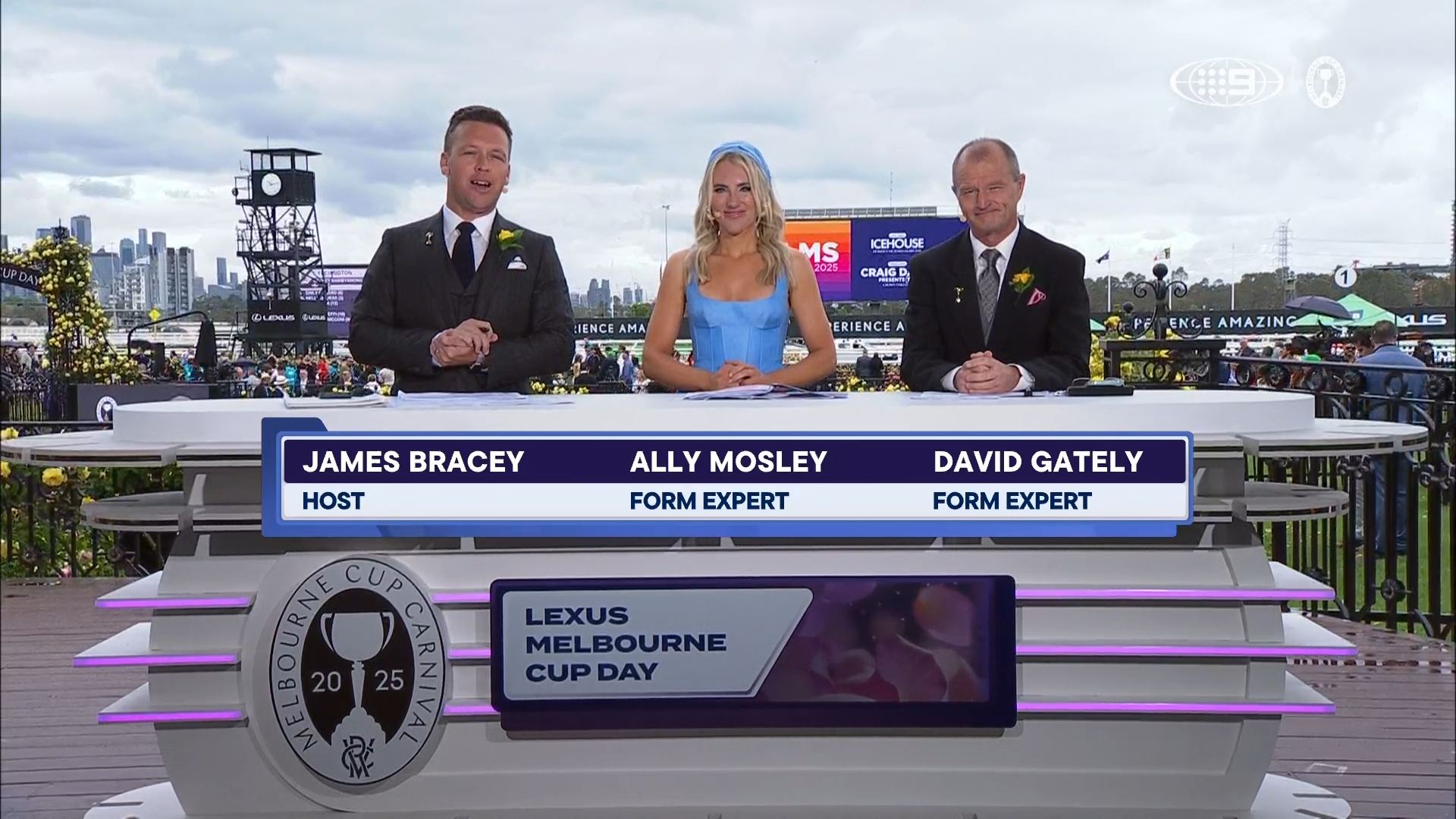 Trackside at the Nine marquee is Karl Stefanovic, Sarah Abo, Danika Mason and Jayne Azzopardi (Today), Ally Langdon (A Current Affair), Sam Armytage (The Golden Bachelor), Jelena Dokic (Grand Slam Tennis), Steven Bradbury (Winter Olympics on Nine), Tom Steinfort and Alicia Loxley (9News Melbourne), Evelyn and Duncan (MAFS) Dan Reilly (The Block), Sylvia Jeffreys (Today Extra), Emma Verran (NRLW/State of Origin & Olympic Rugby Sevens Gold medallist), Ruan Sims and Allana Ferguson (NRL on Nine), Bear (The Golden Bachelor), Clint Stanaway (Weekend Today), amongst a stellar cast of 9Network talent.