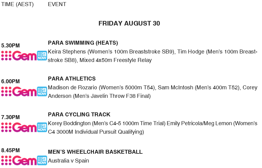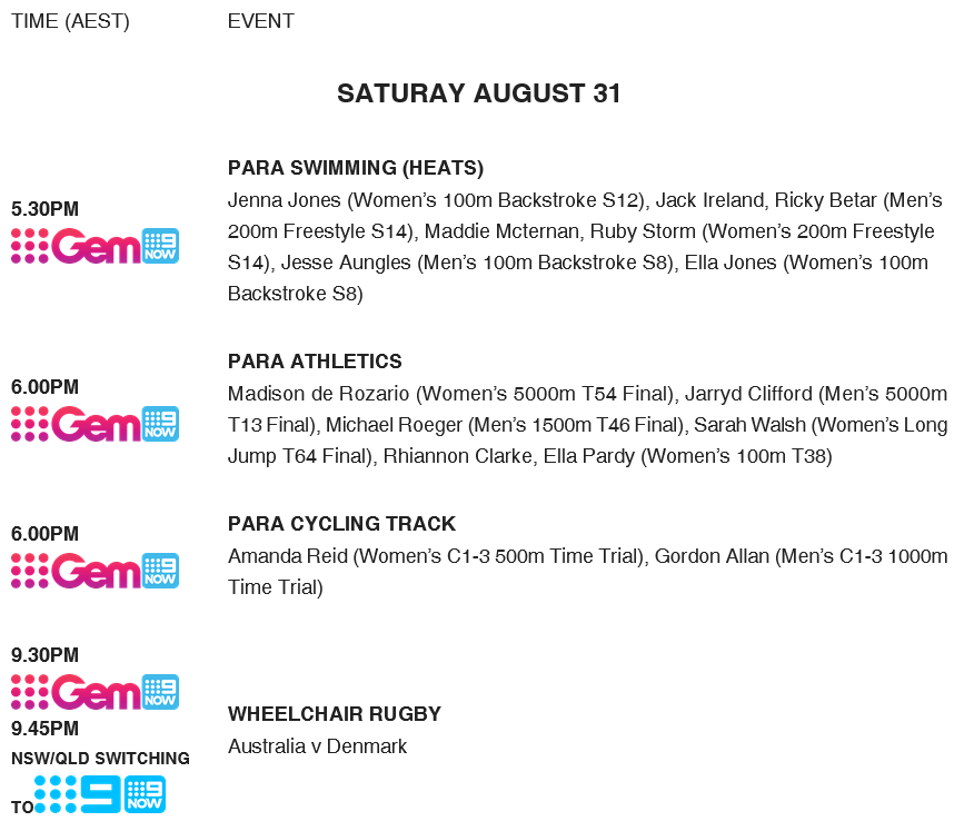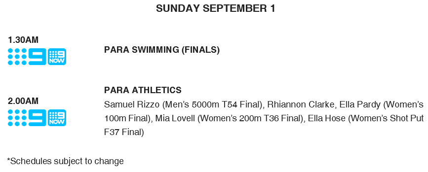 All the LIVE action is available on a curated Paralympics channel across Channel 9HD and 9GemHD, with every moment streamed on 9Now, where you can also stay up to date with Daily Highlights, Daily Top 10 Moments, and curated highlights for Team Australia, Para Swimming and Para Athletics.