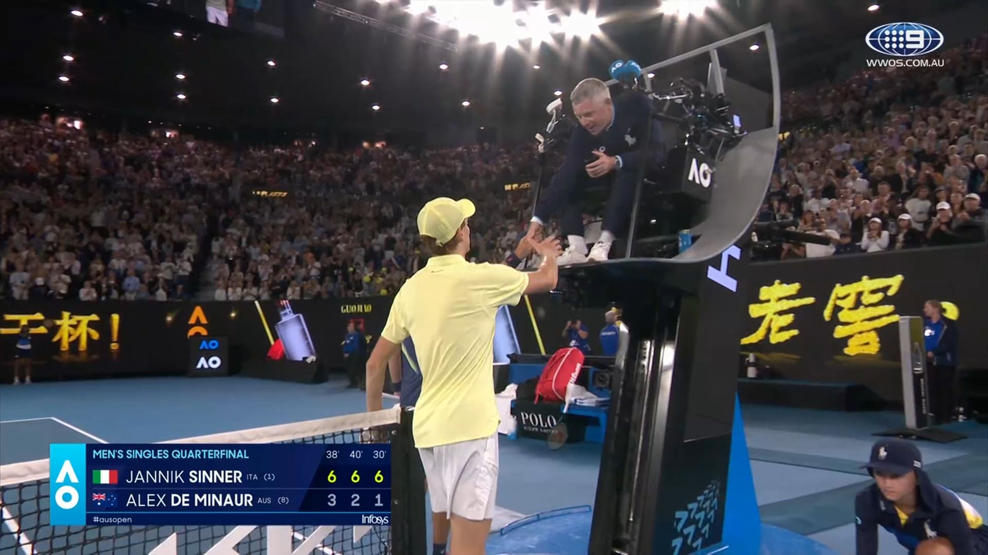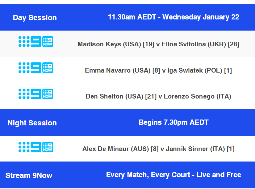DAY 11: AUSTRALIAN OPEN BROADCAST SCHEDULE DE MINAUR V SINNER - 7.30PM AEDT ON CHANNEL 9 AND 9NOW A Demon meets a Sinner in the quarterfinals on the 9Network from 7.30pm AEDT, when the nation throws it support behind Alex De Minaur on Australian Open Day 11.