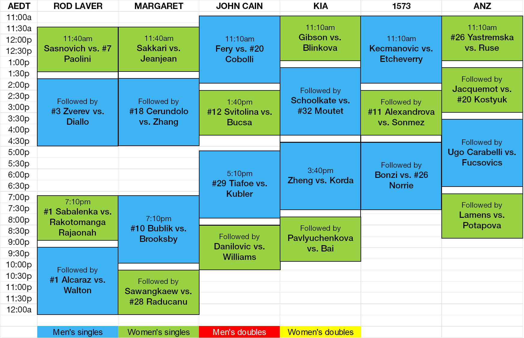 An idea of what Nine will be working with for Day 1 feature matches this Sunday on the three arenas, including three (lower ranked) Aussie men. Also includes Alcaraz, Sabalenka, Zverev, Raducanu, Tiafoe, and Norrie: