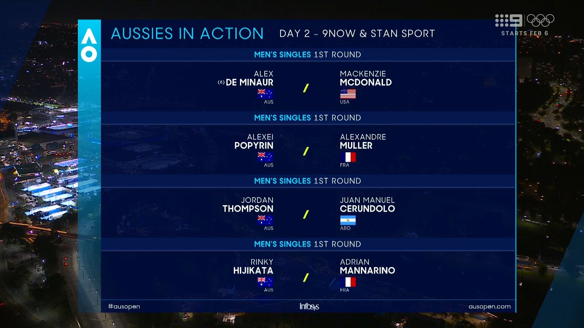 But a shame they couldn’t put the 3hr 5 set comeback epic with the two Americans including Seb Korda (son of 1998 AO champ Petr) on broadcast, instead accessible on 9Now or Stan. It was on Nine earlier today though, briefly.