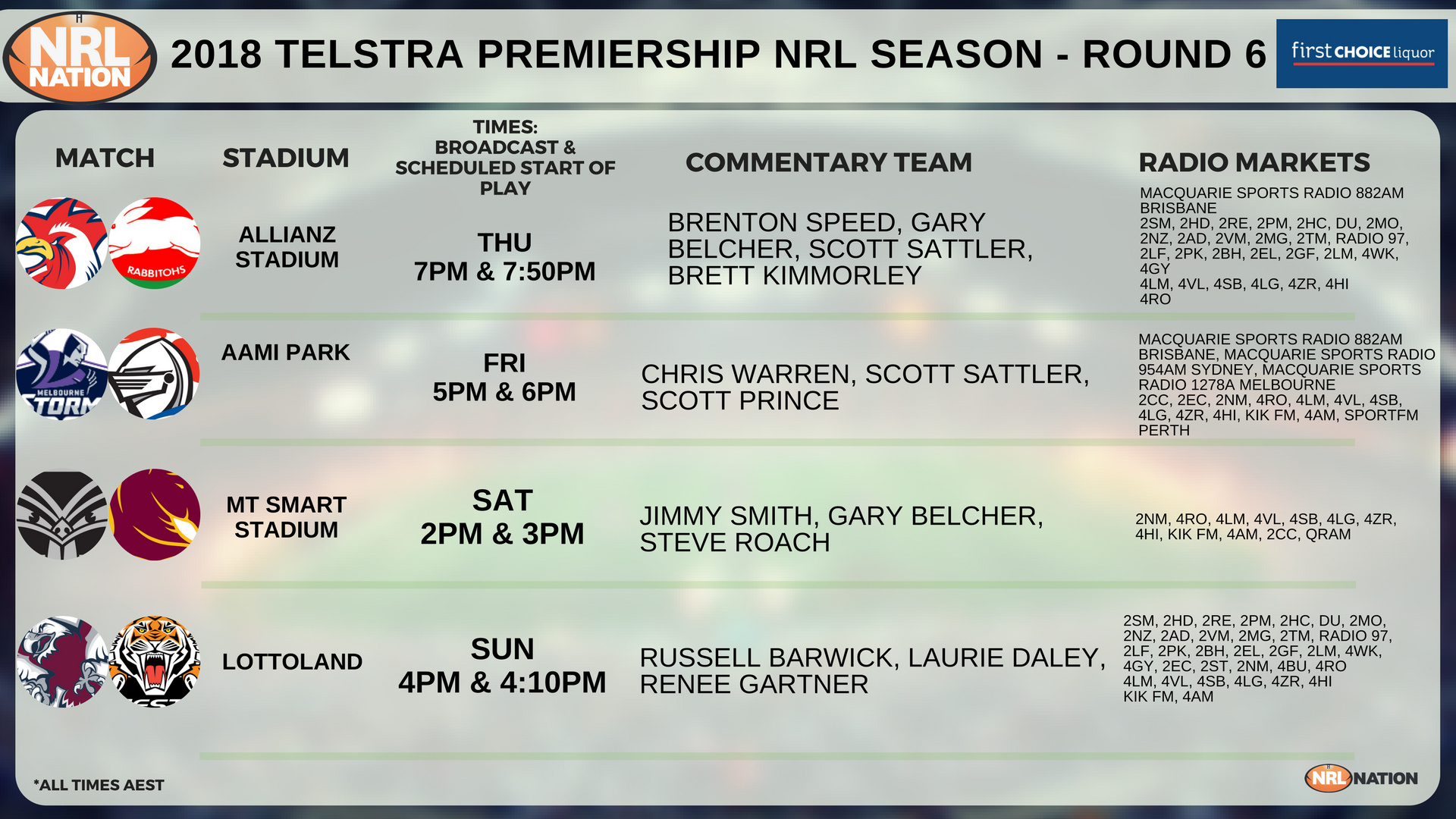 NRL Nation coverage for Round 6. Note Macquarie Sports Radio in Melbourne is mentioned for the first time.