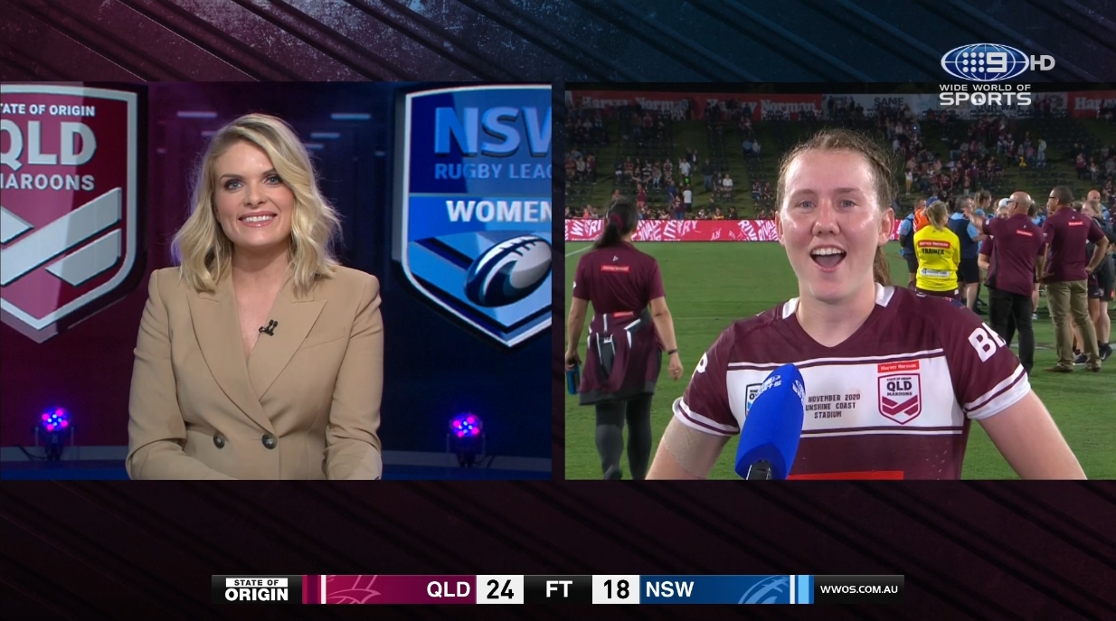 Erin Molan, Allana Ferguson and Ruan Sims presenting tonightâs Womenâs State of Origin from Sydney studio. Peter Psaltis calling the match at Sunshine Coast Stadium with former Jillaroo Jo Barrett and Wally Lewis. Darren Lockyer is sideline reporter.