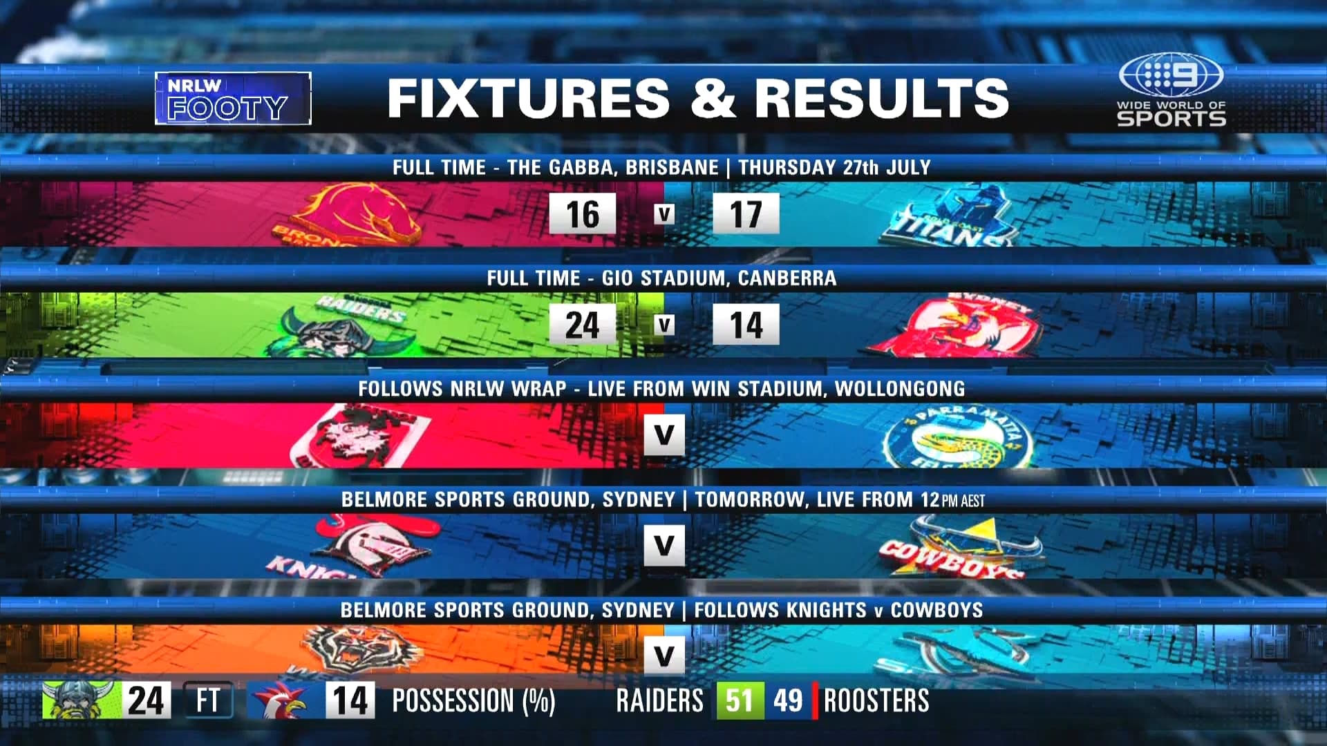 Sunday is a rest day, but not for NRL on Nine with Andrew Johns, Billy Slater, Brad Fittler and Danika Mason dissecting the week of footy at 11.00am on the Sunday Footy Show. Straight after comes an NRLW double-header, before Sunday Arvo Footy pits the Raiders against the Bulldogs.