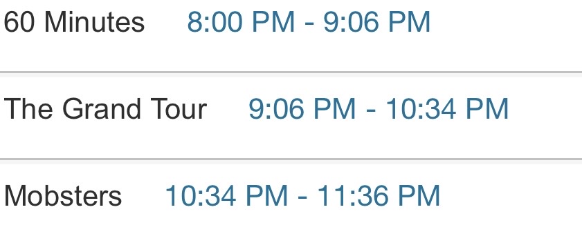 Actually, 60 doesn’t seem to have been in the schedule in the east. The guide site I use (ontvtonight) lists TGT from 10:46 on NBN. Mobsters follows at 12:15 listings time.