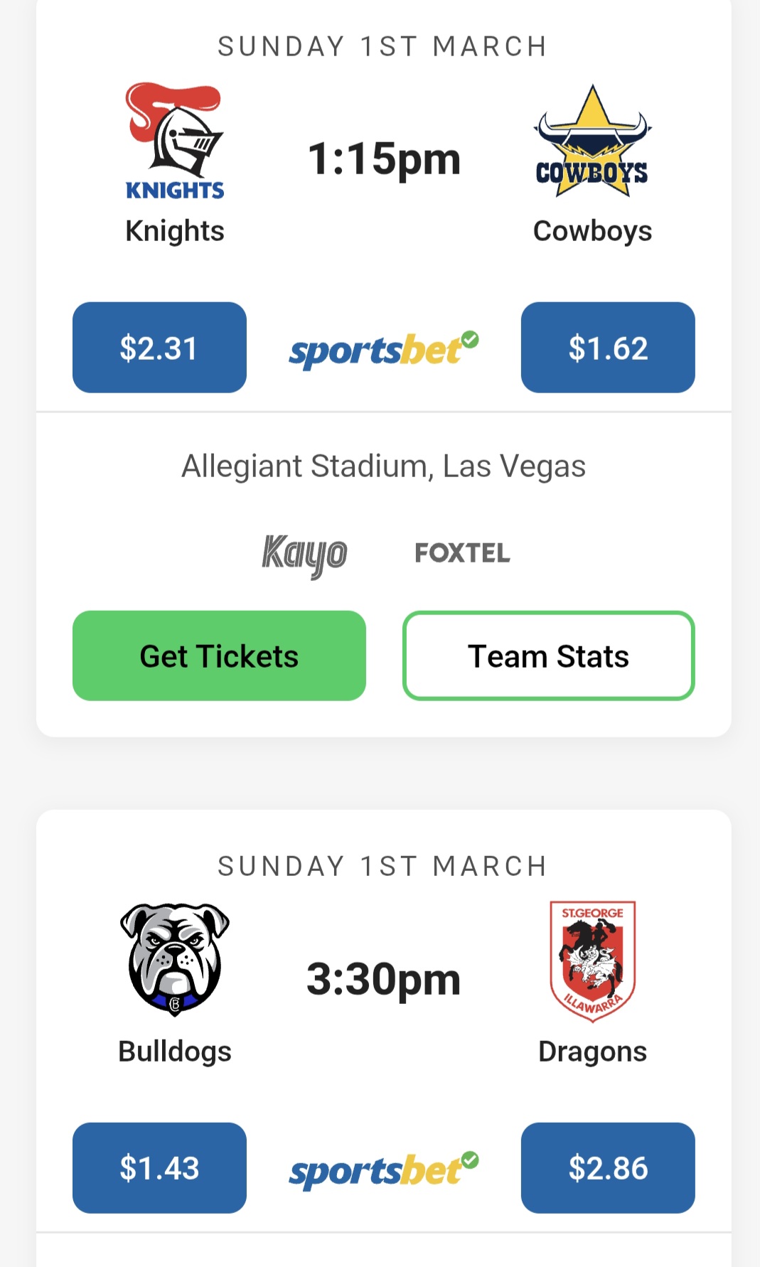 Looks like the Las Vegas FTA game will be Bulldogs vs Dragons (with Knights vs Cowboys as the pay exclusive).