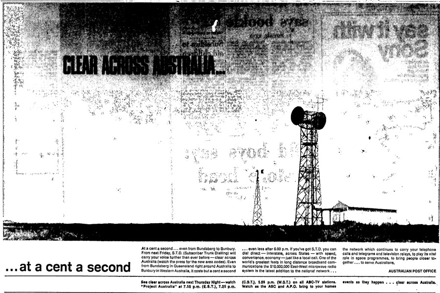 9 July 1970: ABC presents Project Australia, marking the launch of the microwave link between the east and west coasts of Australia, allowing the direct transmission of program material across the country for the first time. It also had the benefit of allowing subscriber trunk dialling (STD) across the country, instead of telephone users having to go through an operator.