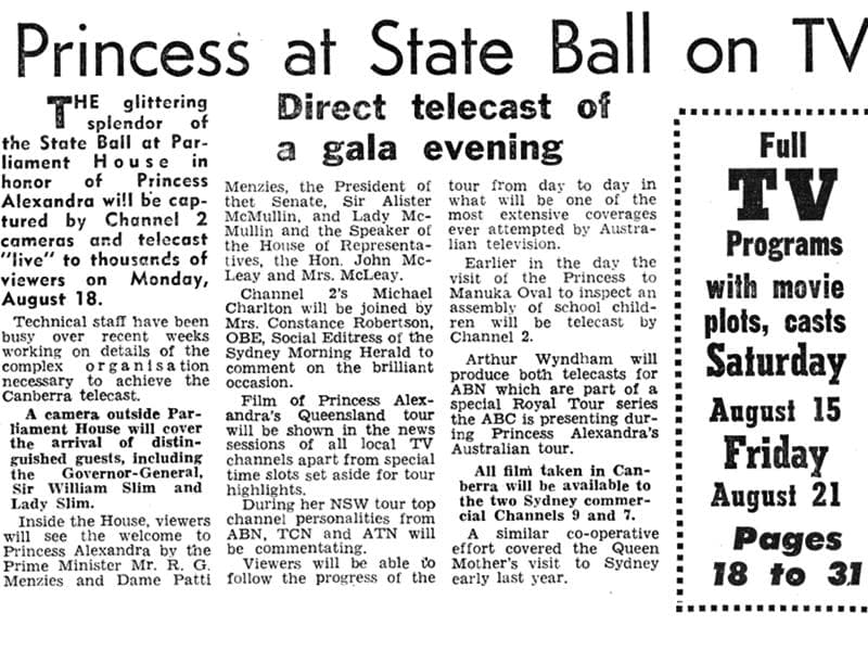 17 August 1959: All three Sydney channels present coverage of Princess Alexandra’s visit to Canberra in what is still considered to be a rare technical feat, requiring weeks of planning by technical staff, particularly as there was at the time no TV services operating in Canberra itself. Sydney’s ABN2 was the host broadcaster, with its coverage being made available to ATN7 and TCN9, though the commercial channels also provided their own commentaries of the royal visit. Film of ABN2’s coverage of the day’s events was sent to Melbourne for transmission on ABV2 later in the week.