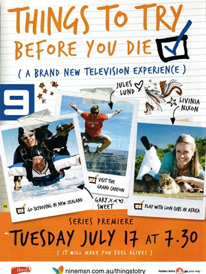 17 July 2007: The Seven Network premieres factual series RSPCA Animal Rescue. The Nine Network premieres travel/adventure series Things To Try Before You Die, featuring Gary Sweet, Livinia Nixon and Jules Lund.