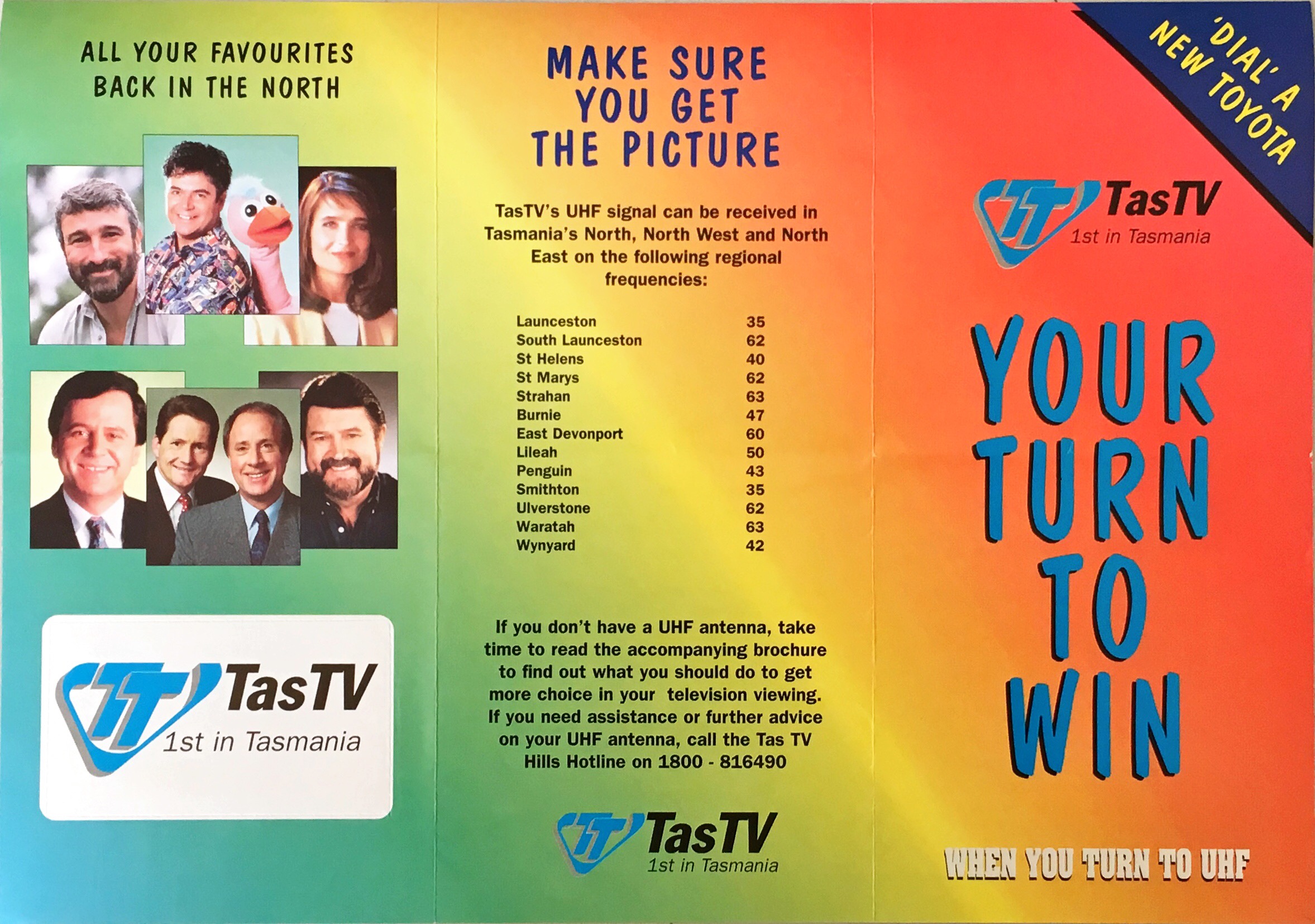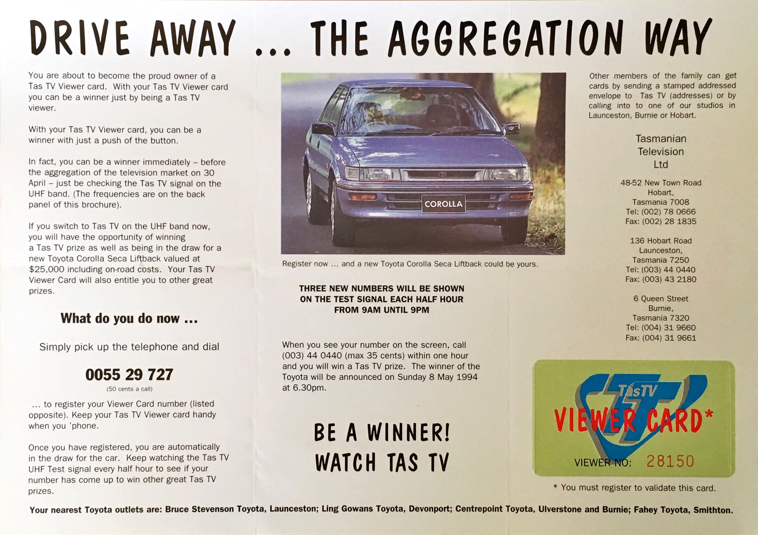 30 April 1994: Aggregation launches in Tasmania, with Hobart-based TAS TV expanding into northern Tasmania, and Launceston-based Southern Cross Network expanding south. TAS TV was aligned to the Nine Network, and Southern Cross to Seven/Ten. Aggregation also coincided with SBS expanding into northern Tasmania, and Launceston’s ABC channel ABNT3 commencing broadcast on UHF.