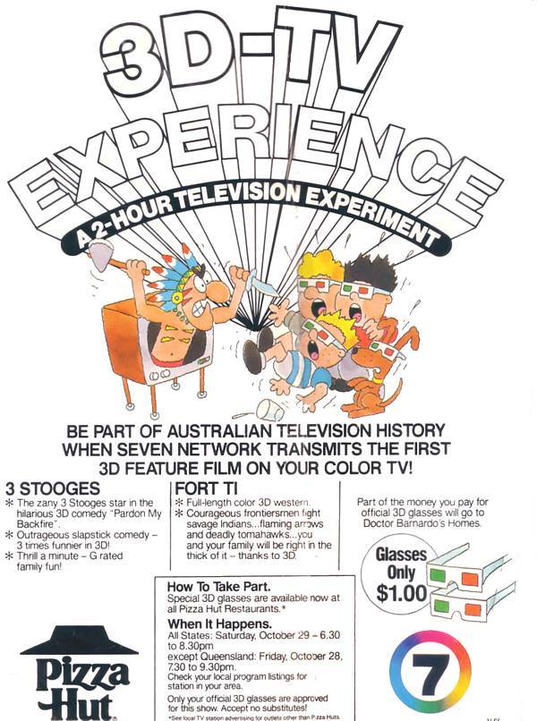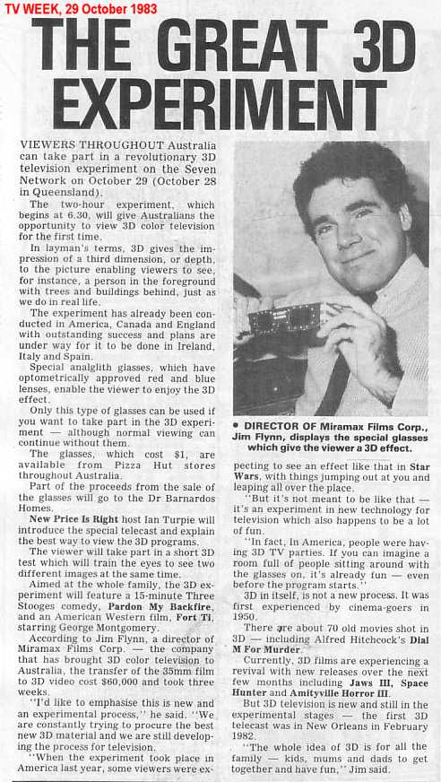 29 October 1983: The Seven Network* screens two hours of movies in 3D. The broadcast was carried on some regional stations, such as CTC7 in Canberra.