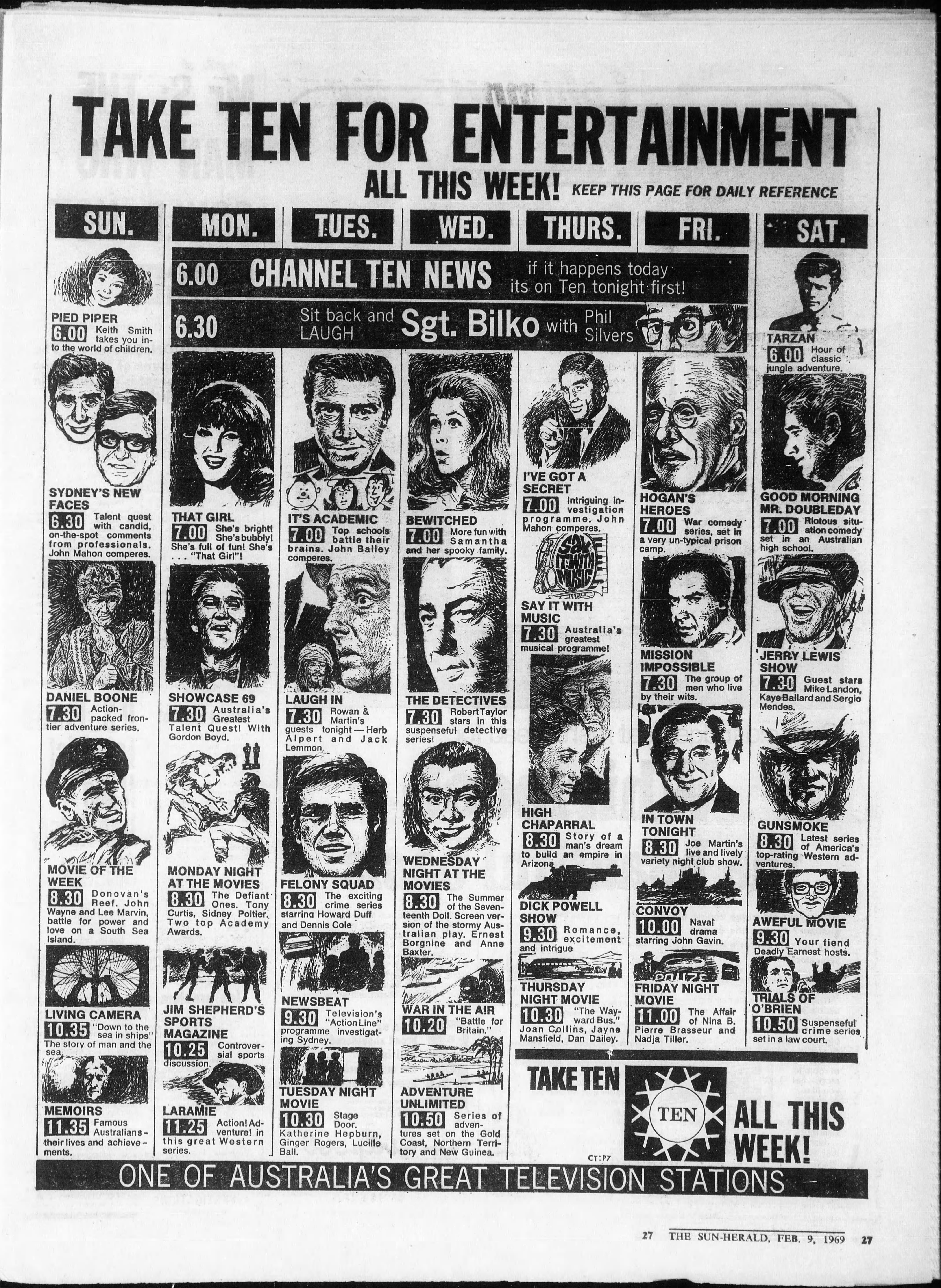9 February 1969: Melbourne produced sitcom Good Morning Mr. Doubleday begins on ATV0 at 7.30pm. It had premiered on TEN10 the day before having only commenced filming three weeks earlier at 0’s Nunawading studios and Kyneton High School. The show, about a vague young high school science teacher played by Sydney comedian Gerry Gallagher, is an early attempt by the 0-10 Network to boost local content in order to meet new requirements set out by the Broadcasting Control Board. Television writers in The Age and SMH give it positive reviews but it doesn’t survive beyond the first 26 half hour series order.
