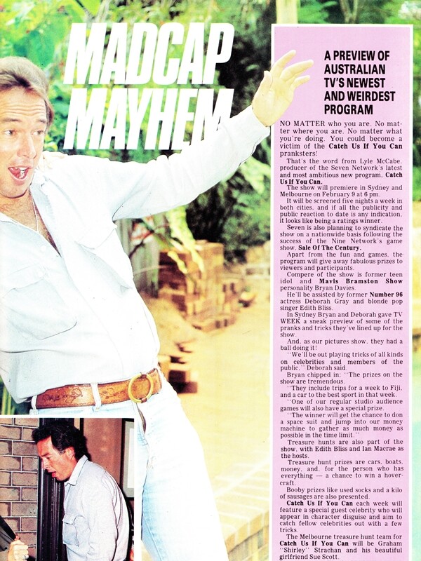 9 February 1981: Game show Catch Us If You Can debuts on Seven in Sydney and Melbourne. Featuring studio and on-location games and stunts, it lasted about ten weeks. Not sure if it aired anywhere outside those two cities.