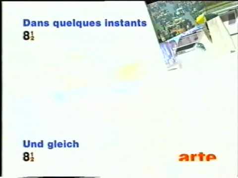 Another thing Lambie-Nairn did was to tidy up the Arte logo, dropping the “overly complicated” design in favour of a straightened up wordmark, coloured orange to make it “look warm” (p176). Alongside the tidied up logo and idents, Arte also introduced the channel’s unique angled “canvas” devices (often shown on a 4-degree tilt), being an important part of presentation and promo devices from now until 2012; the company also designed a presentation kit for Arte’s newscasts at the time, 8 1/2, a bilingual pre-produced newscast with no anchor (Arte Info/Journal wouldn’t being until 1998), plus the weather forecast after the programme.