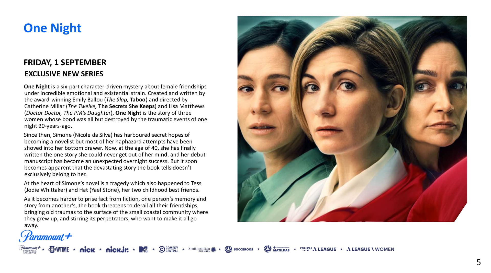One Night is a Paramount+ Australian Original series with major production investment from Screen Australia in association with Paramount+. Fifth Season is handling international sales.