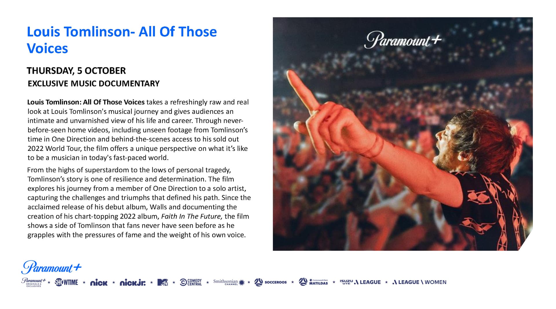 Louis Tomlinson: All Of Those Voices. Streaming Exclusively on Paramount+ From Wednesday, 5 October.