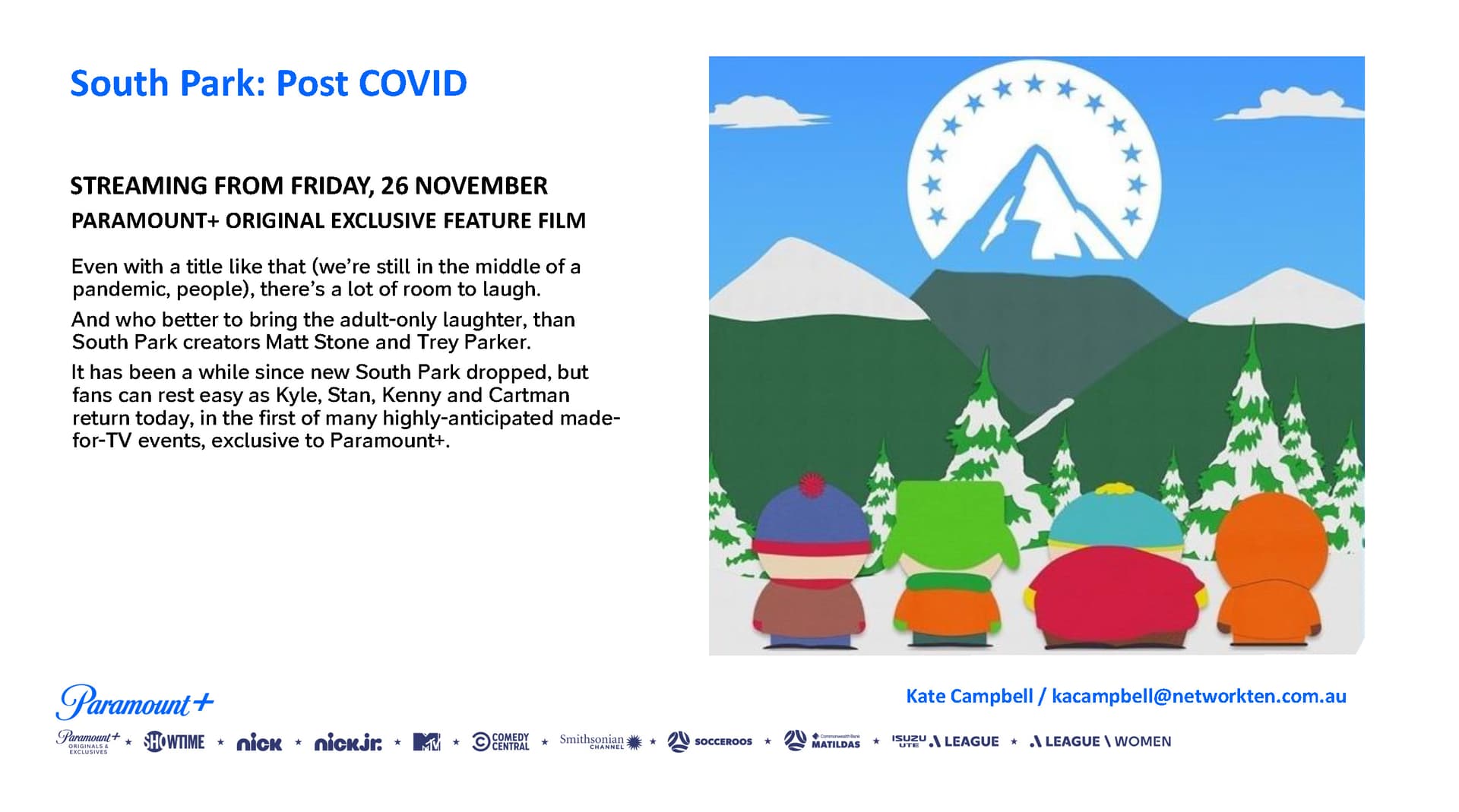 South Park: Post Covid will stream exclusively on Paramount+ in the US on Thursday, November 25, and in Australia on November 26 (see press release below).