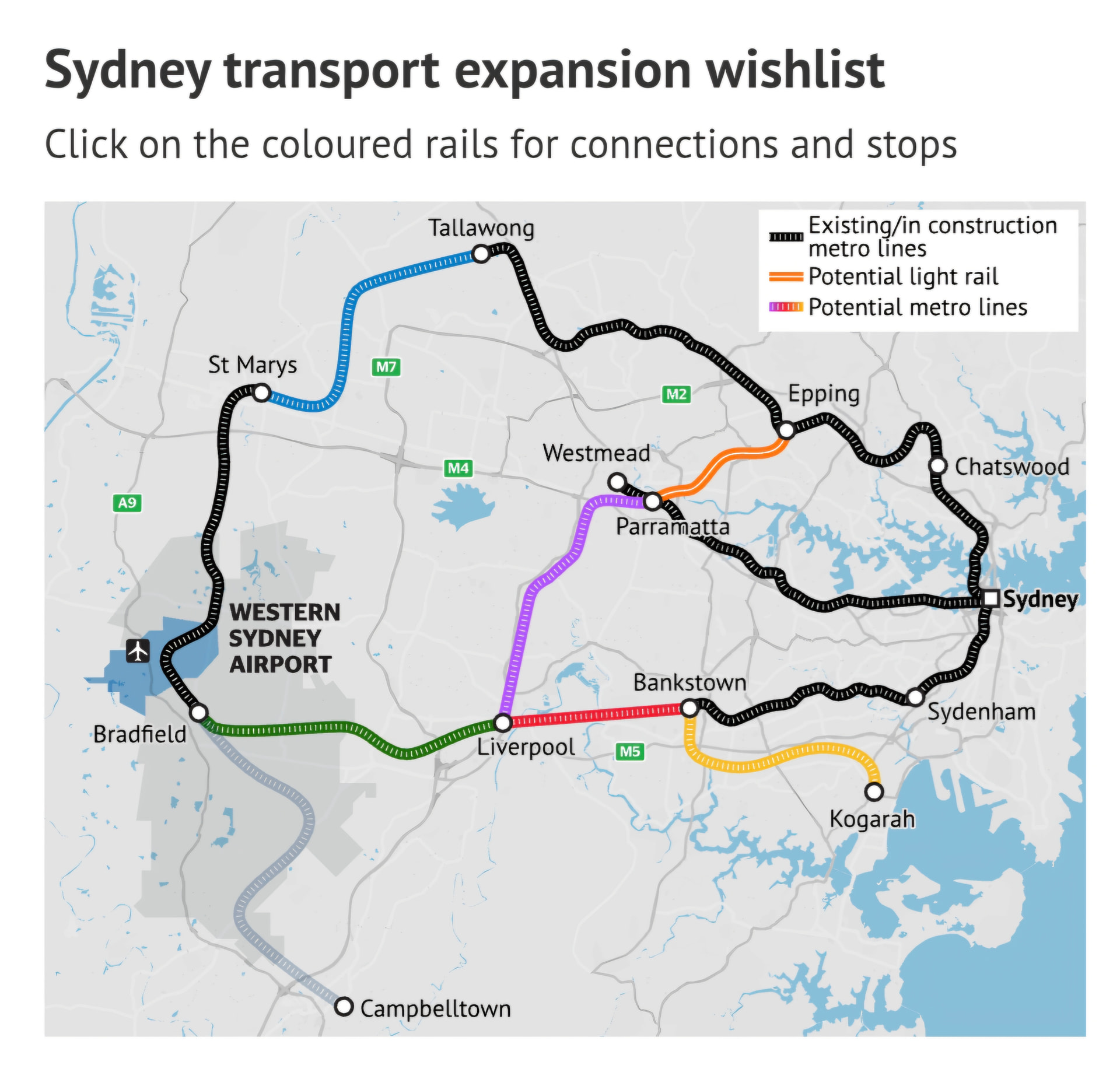 Strange theyâve only shown the Bankstown to Kograh section instead of the full proposed line length to Westmead, and the envisioned Metro West extension to Randwick is also absent