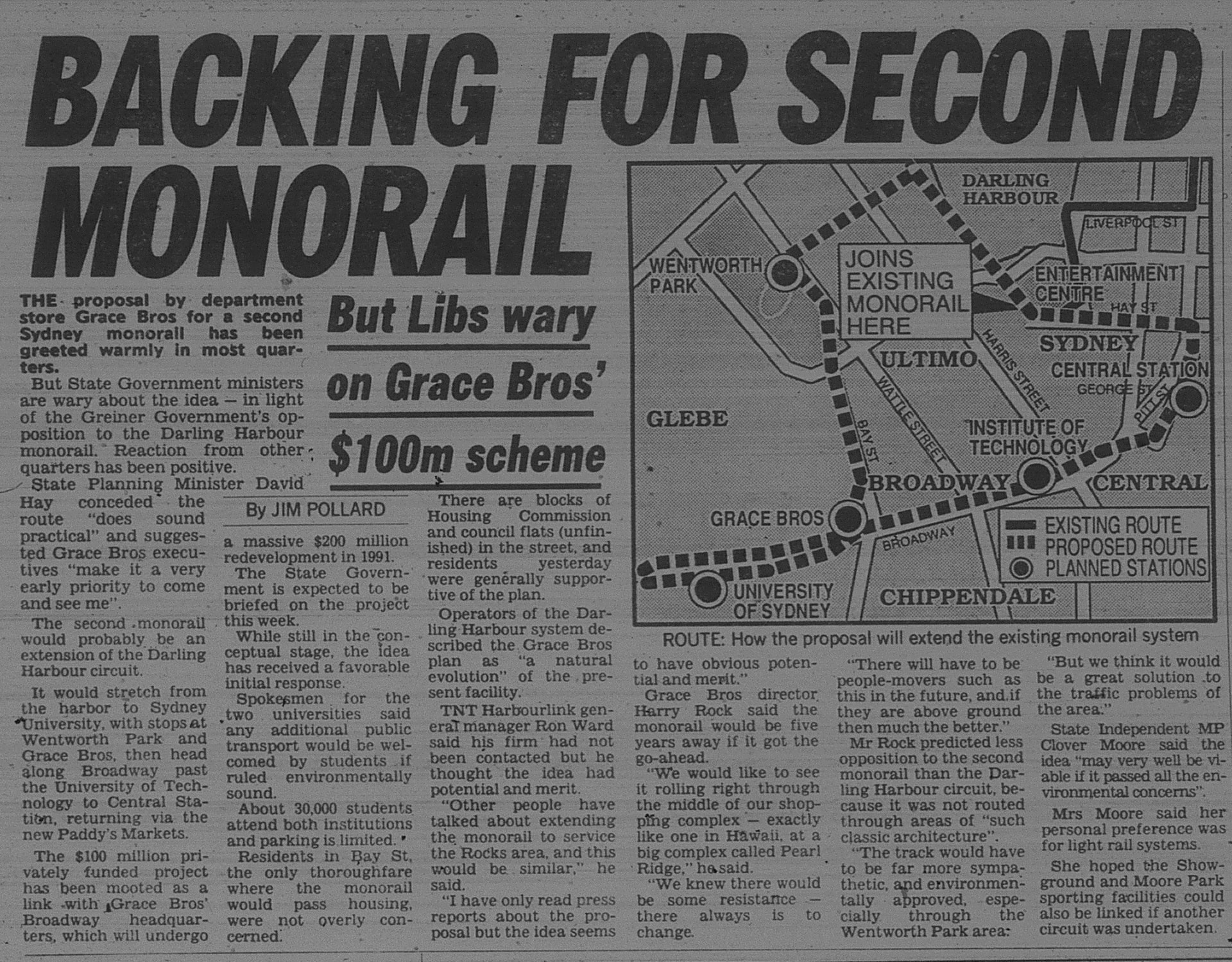 From the Sydney âDaily Mirrorâ 10 October 1988.. there were once plans for a second monorail in the Sydney CBD, servicing Ultimo, Broadway and Central station.