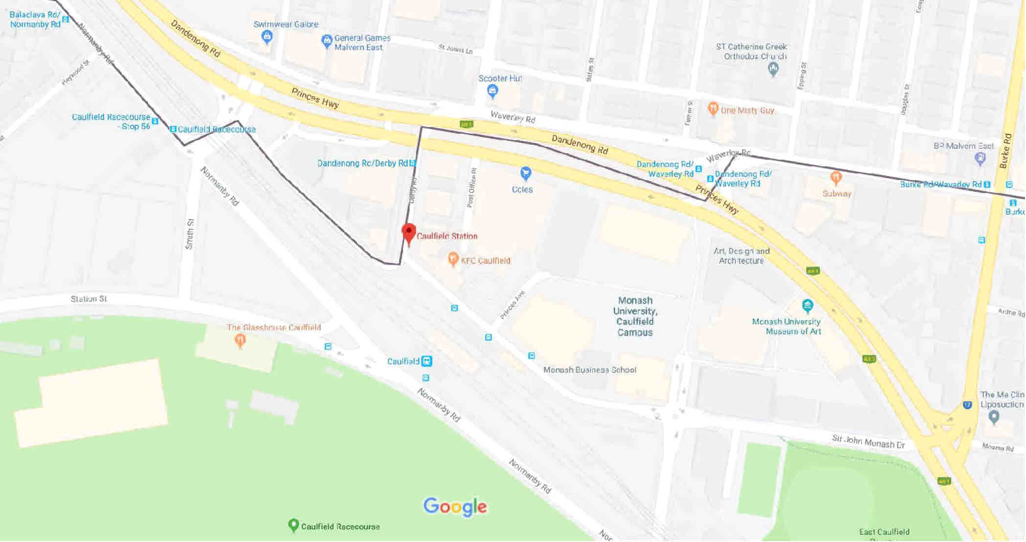 - Caulfield station (intersection of Derby Road and Sir John Monash Drive)
