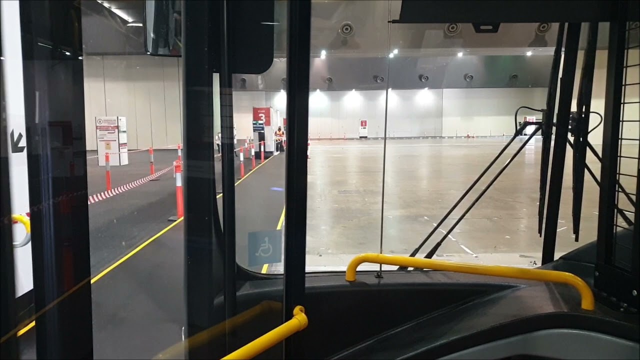An inside view onboard from a bus of a temporary bus station at Perth Convention and Exhibition Centre to cater for the 2021/22 Mandurah Line Shutdown.