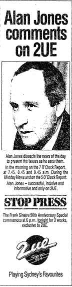 In December that year he was taken off the morning show, reduced to news commentaries during Gary O’Callaghan’s breakfast and other programs for the first half of 1986.