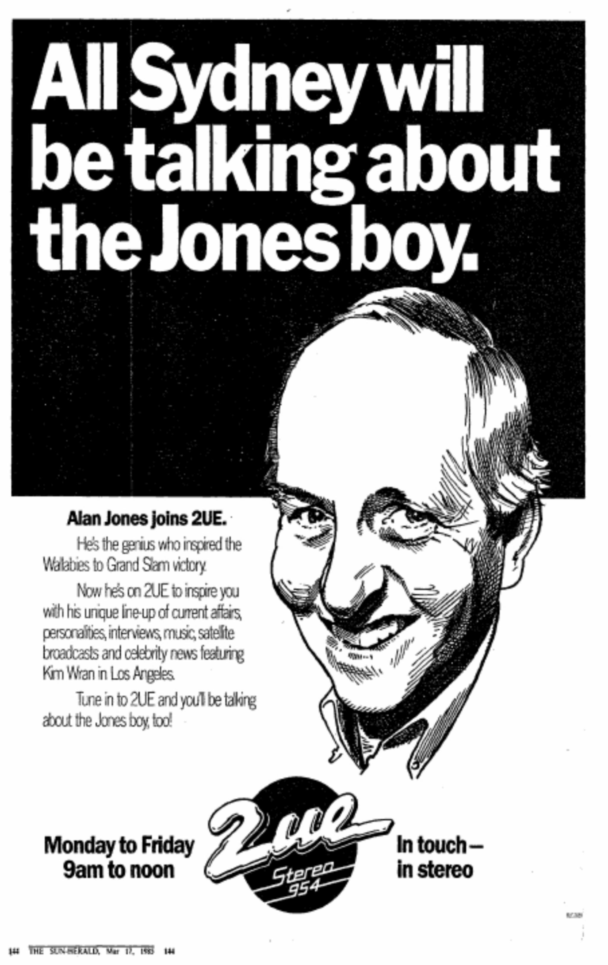 In June that year Jones started doing 10:00am to 11:00am during the CBC era. The format was axed in December 1986, and in 1987 Jones returned to the morning show, 8:30am to 12:00pm, with Philip Adams on breakfast. Jones moved to breakfast in 1988.