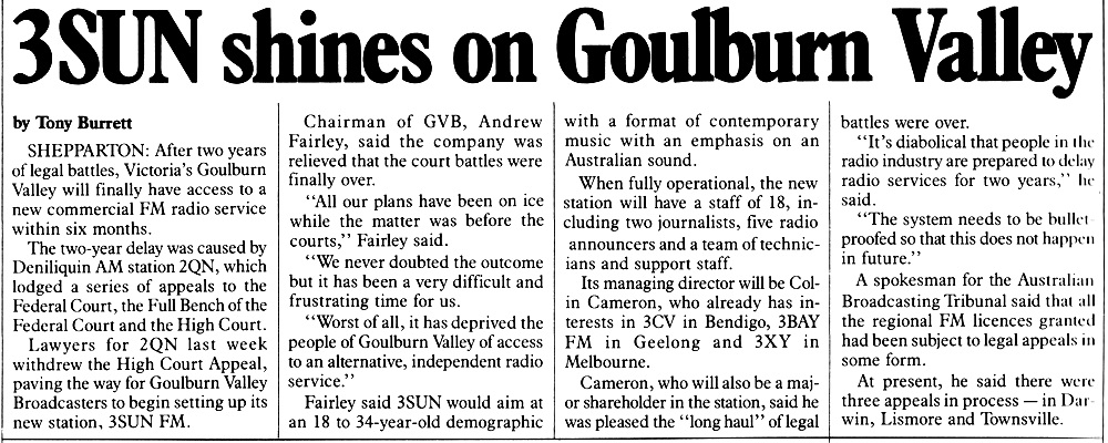 An article from AdNews magazine from March 1990 after 2QN dropped its legal action preventing Sun FM from launching:
