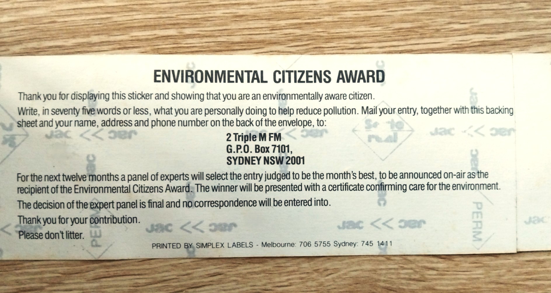 For January 26 various LGAs make nominations for the environmental citizen of the year award. But here’s an interesting campaign from radio history where it seems Triple M Sydney had their own environmental citizens award. What is notable about this promotion is it is completely devoid of any sponsorship, whether commercial or governmental. And the monthly prize is merely a certificate.