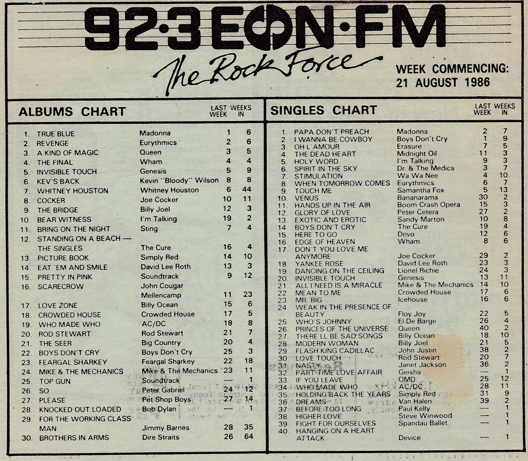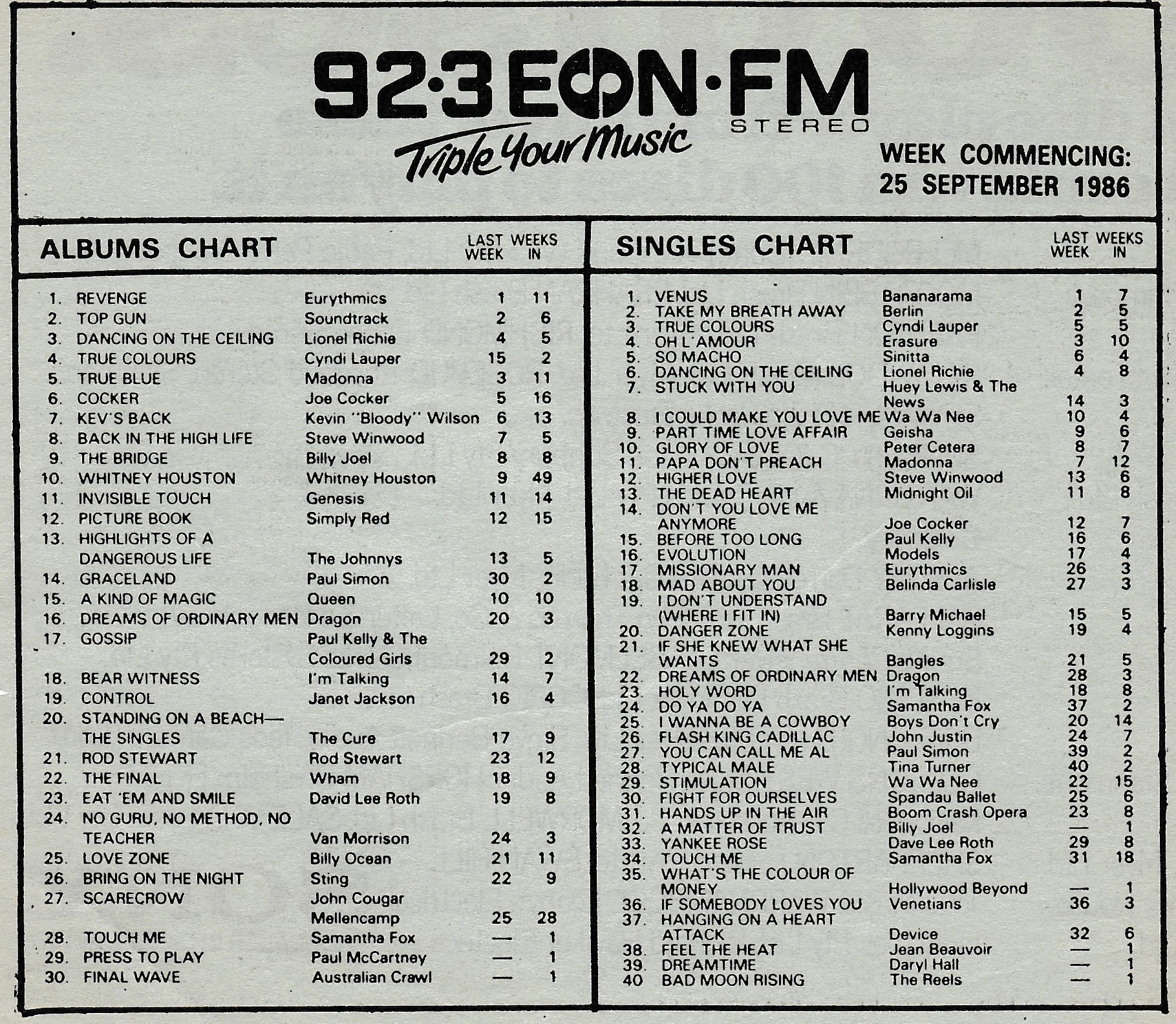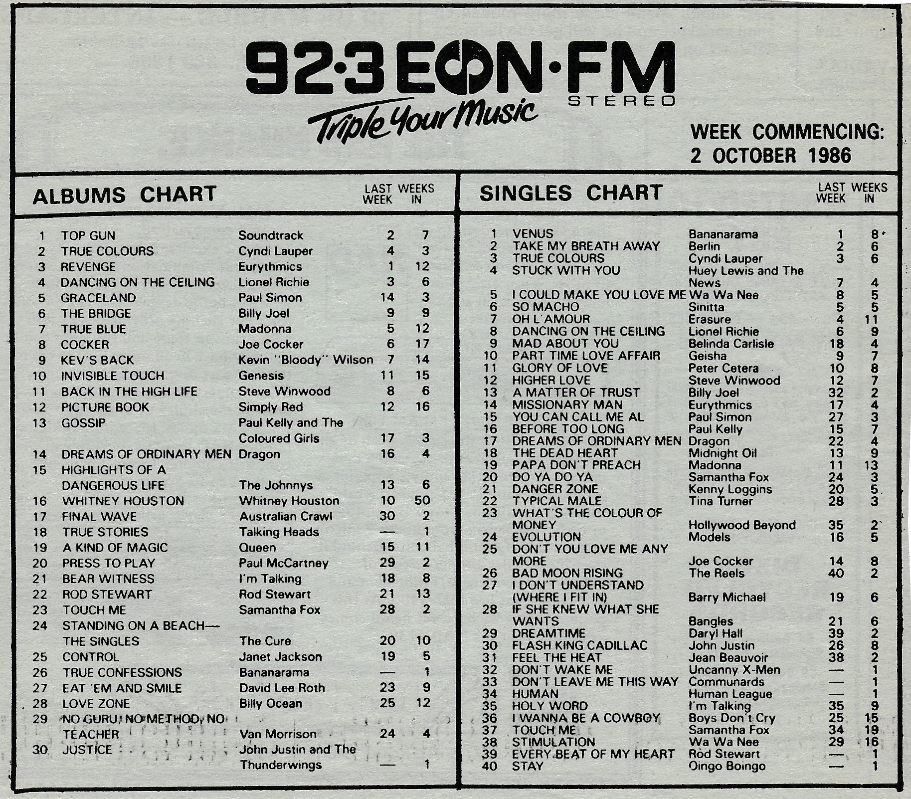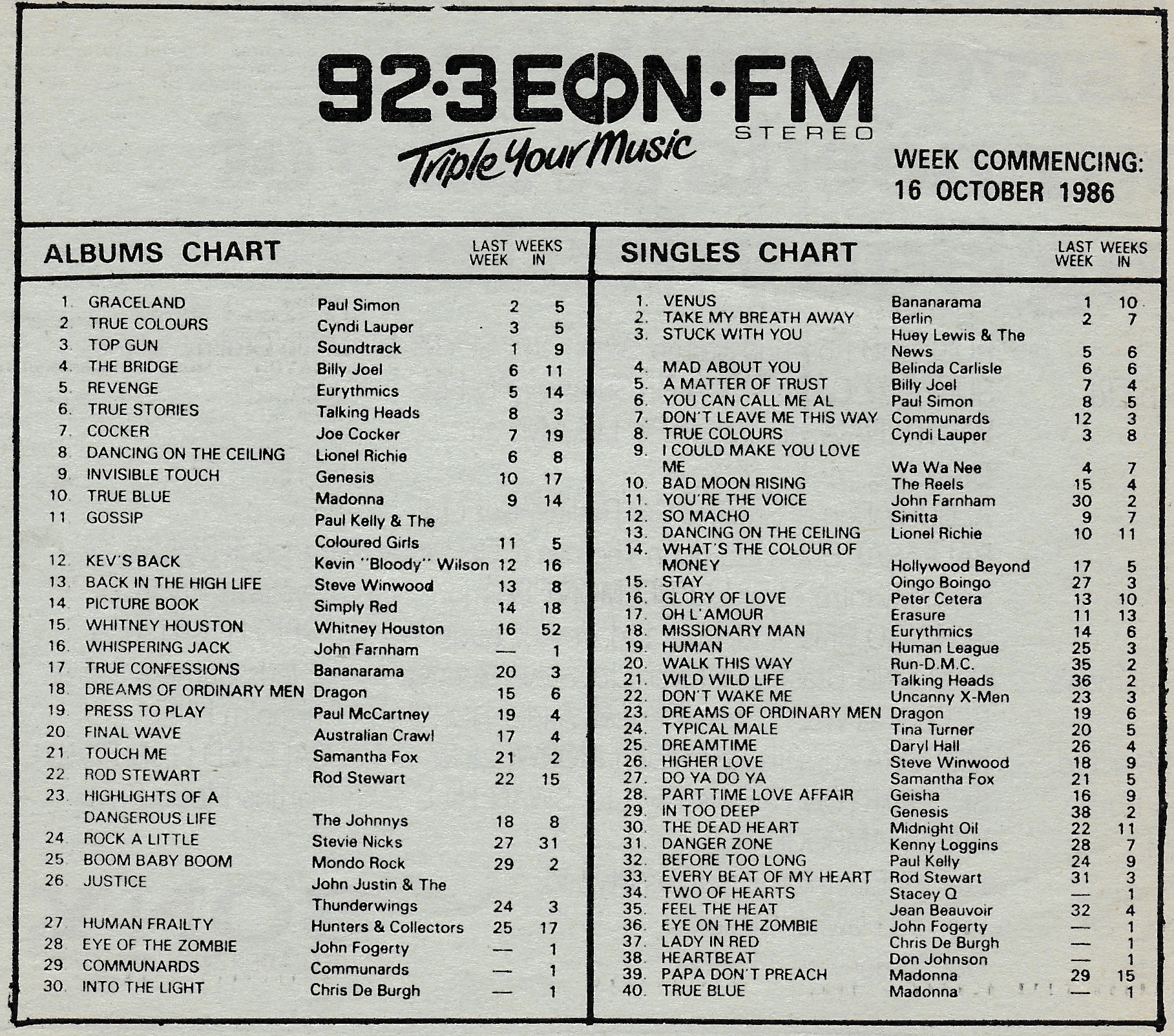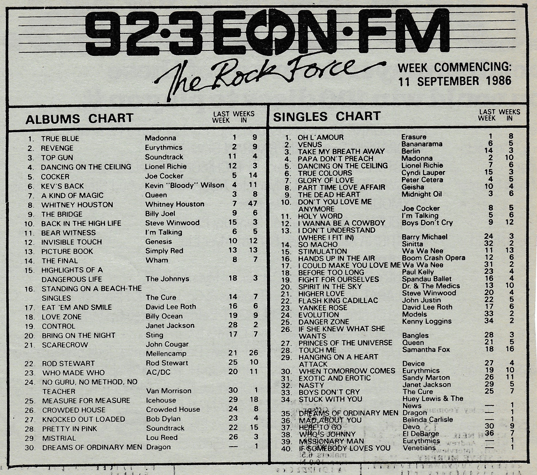 Great charts from '86. They certainly brought back a lot of memories! I didn’t realise Oh La Mour /Erasure actually made it to No 1 in the charts. Although as the charts were state based maybe it didn’t go so high in Queensland. The rest certainly ring true.